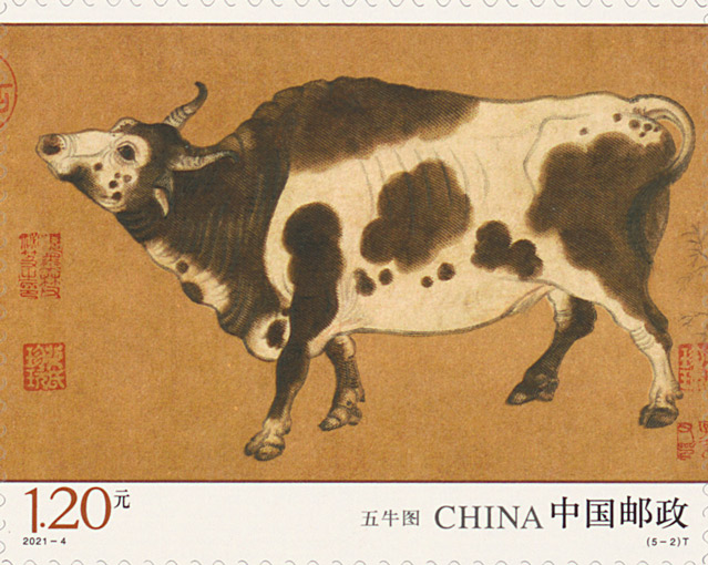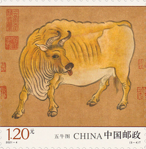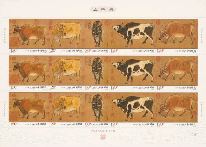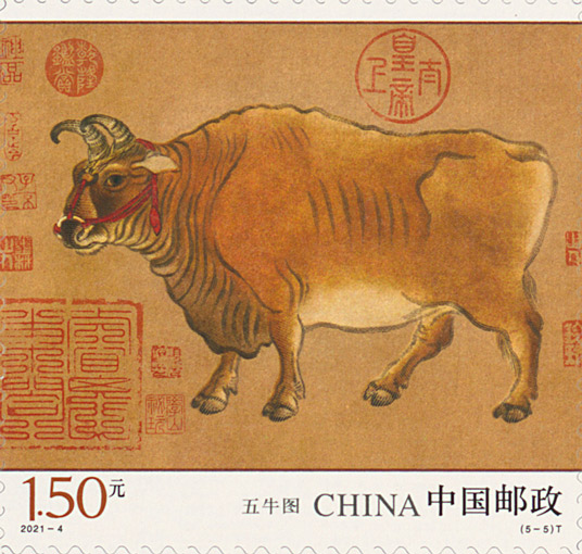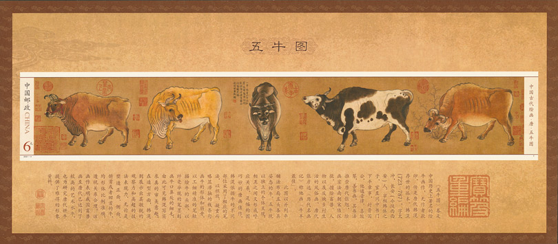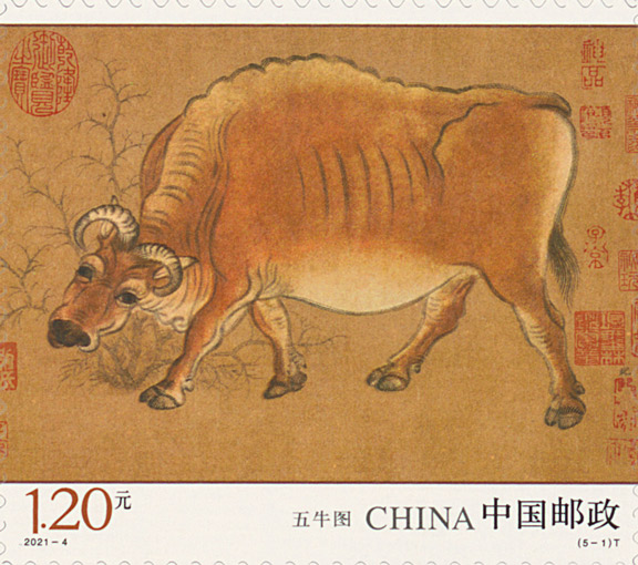 中国邮政定于2021年3月20日发行《五牛图》特种邮票一套5枚,小型张1枚。