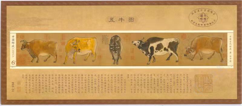 为纪念“国家名片 紫禁瑰宝”故宫主题邮票特展开幕,中国邮政特别发行《五牛图》特种邮票加字小型张,编号PZJ-21。