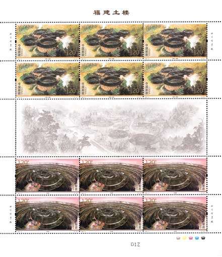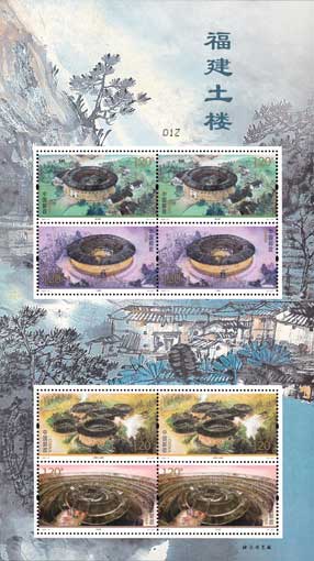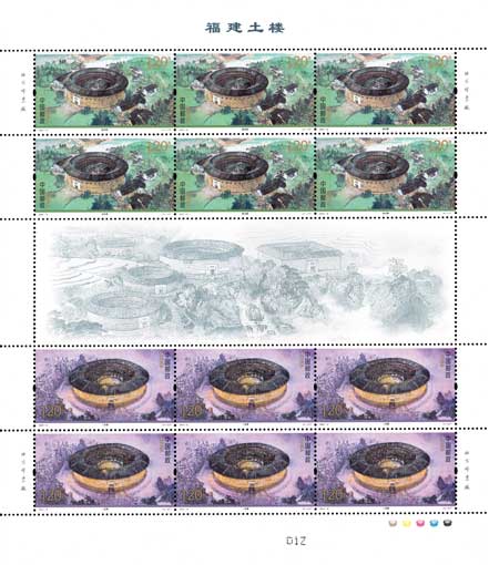 该套邮票以土楼的四季为主题,表现了振成楼、二宜楼、田螺坑土楼群、承启楼。四幅作品采用中国传统绘画工写结合的表现手法,色彩鲜明饱满,对土楼的文化内涵深入挖掘。在无限被重复的方形和圆形中,四季变化的微妙感受与天地参合的奥秘形象地表达出来,赋予土楼新的视角和色彩;光与影的变化使画面变得轻灵空旷;而高空俯视的视角则使构图体现出更富于扩张感的空间意识,演绎出与众不同的土楼造型与人文气息,突显土楼这种建筑形式承载的向心、团结的情感内蕴,同时版式一、二均饰以精美的绘画,土楼的主题跃然纸上。