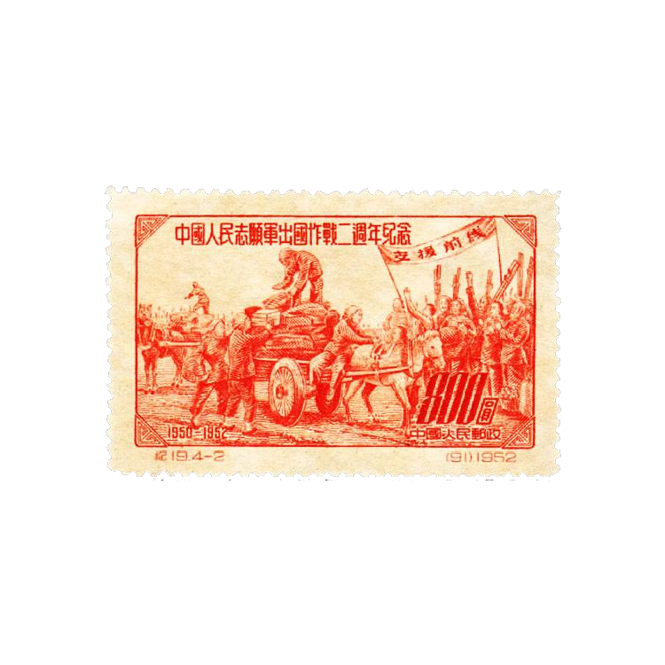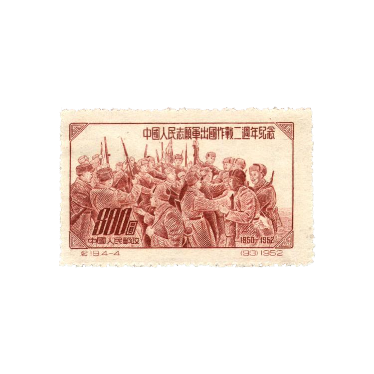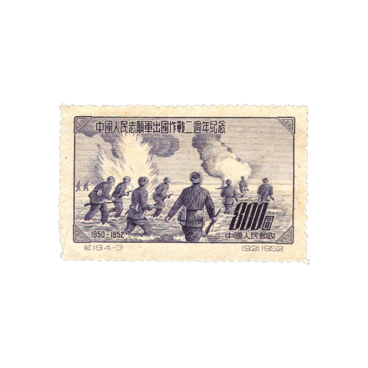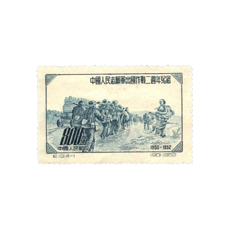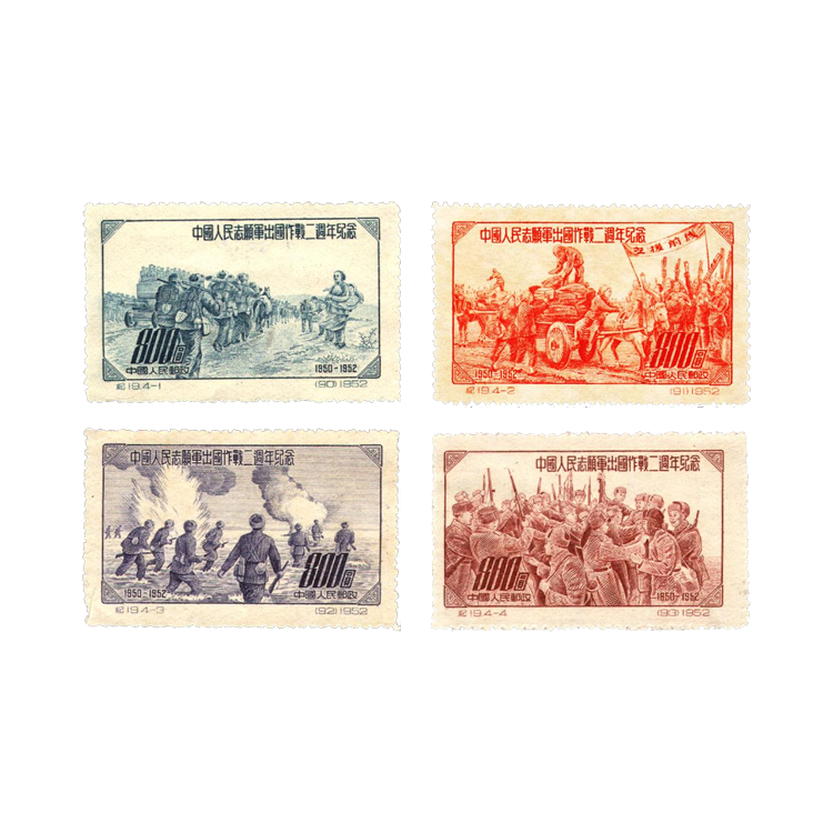 中国邮电部为纪念中国人民志愿军出国作战二周年,在1952年11月15日发行原版,1套4枚。