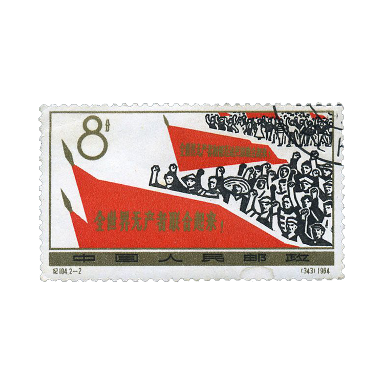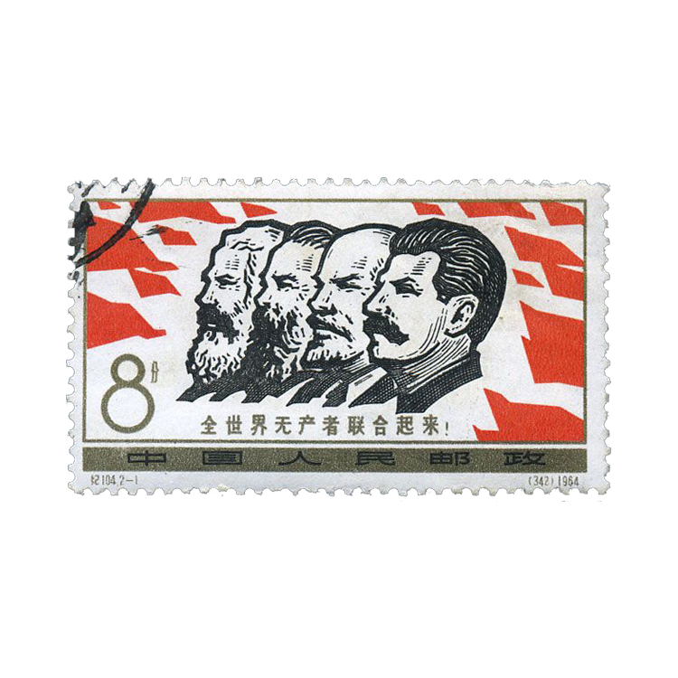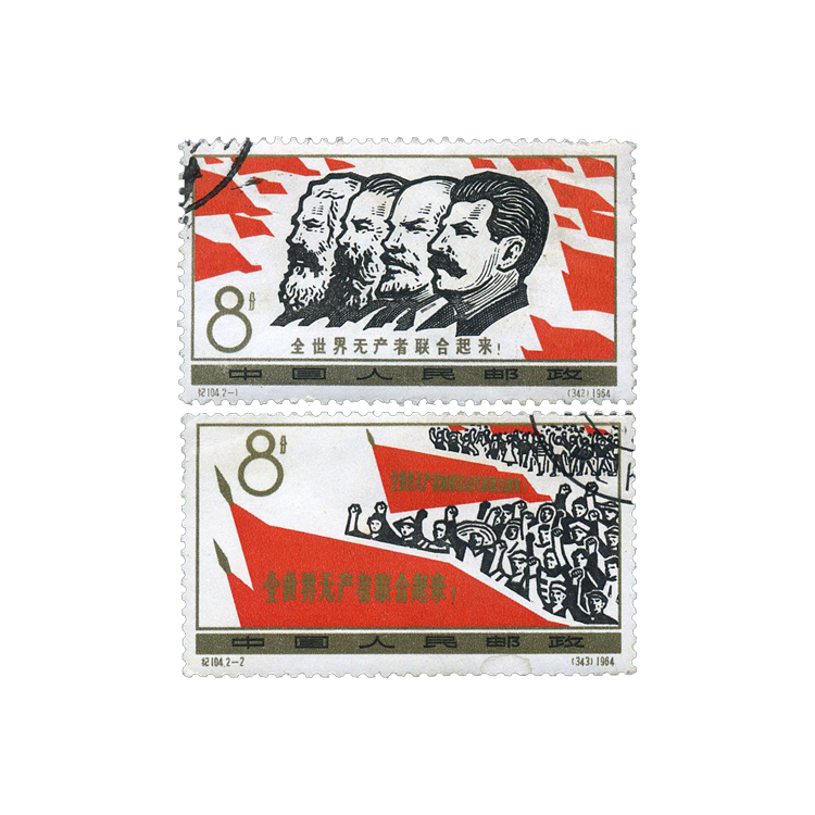 1964年5月1日, 正值庆祝“五一”国际劳动节之际,也在第一国际成立100周年之际,邮电部发行的这套纪念邮票,即以马克思和恩格斯的头像为主图,衬以国际共产主义运动旗帜。