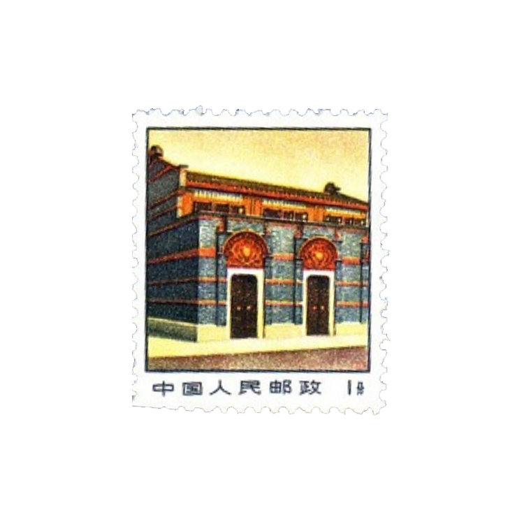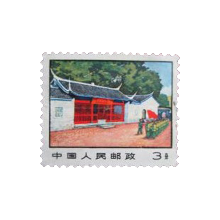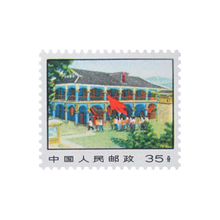 图11-5为“遵义会议会址”,邮票画面为一座砖木结构的曲尺形洋房。一楼一底,正门矗立一高大牌坊。1935年1月,中国工农红军第一方面军长征到达遵义,于15日至17日在此召开政治局扩大会议。这次会议确立了毛泽东在党内的领导地位,结束了王明“左” 倾冒险主义在中共中央的统治,为红军胜利完成二万五千里长征奠定了基础。