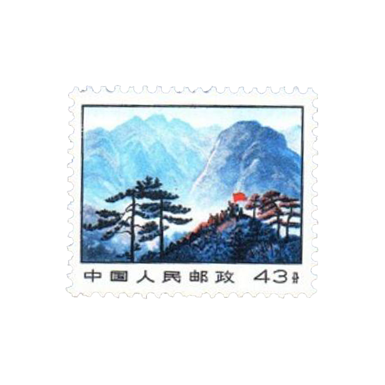图11-6为“井冈山主峰”,邮票画面上展示了雄伟险峻、绵延起伏的井冈山,青松挺拔,红旗招展。