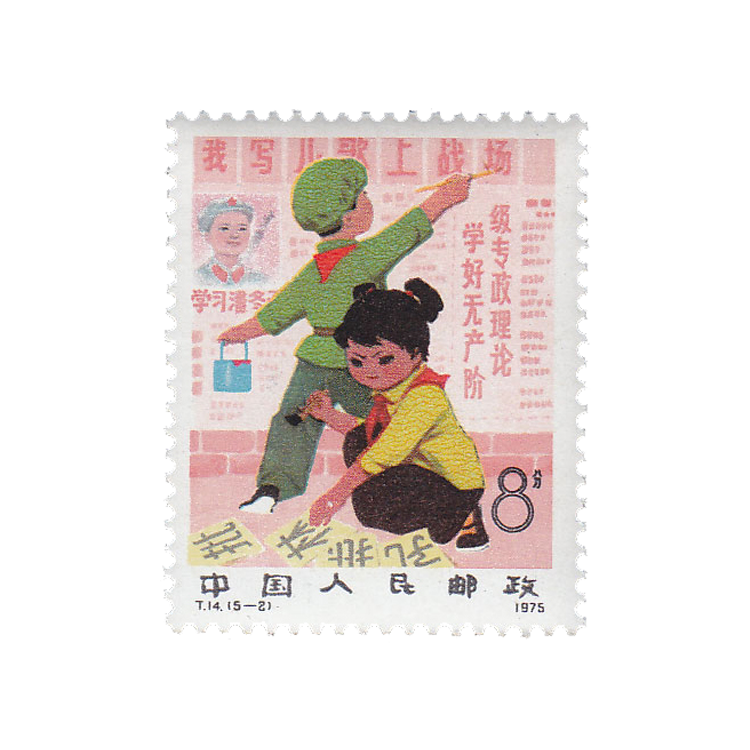 第二图:《我写儿歌上战场》。“文化大革命”中,在儿童中开展了所谓大批判活动,邮票画面就反映了这一历史事实。套邮票的第二套是表现写大字报的“我写儿歌上战场”,图案中使用电影《闪闪的红星》中潘冬子的剧照作为邮票画面背景来处理,也体现了当时文革后期的历史背景。因这一枚中的小女孩在整理的大字报为“批林批孔”。基于此把这套邮票俗称为“小批”,而把T8的“批林批孔”俗称“大批”,与之相对应。