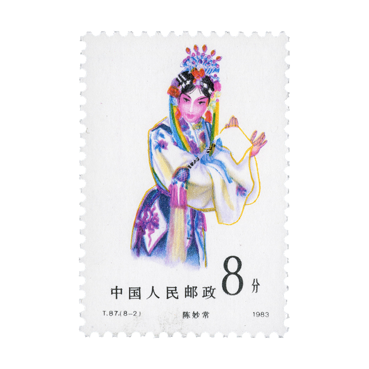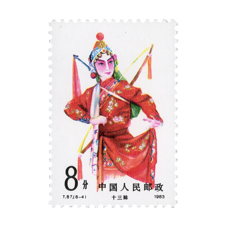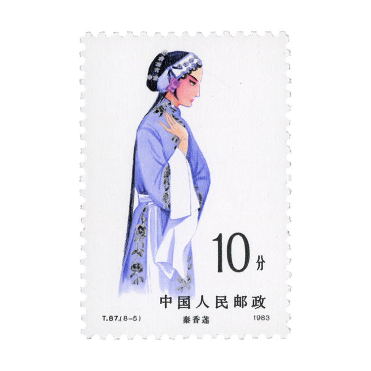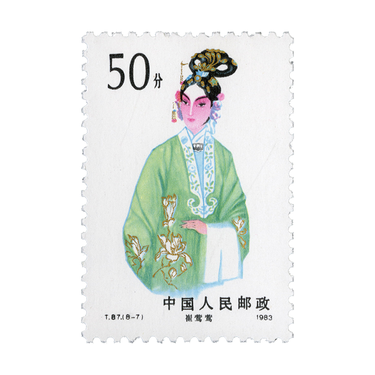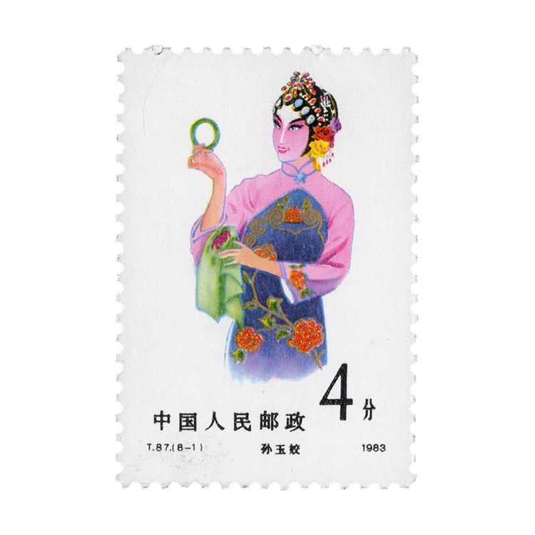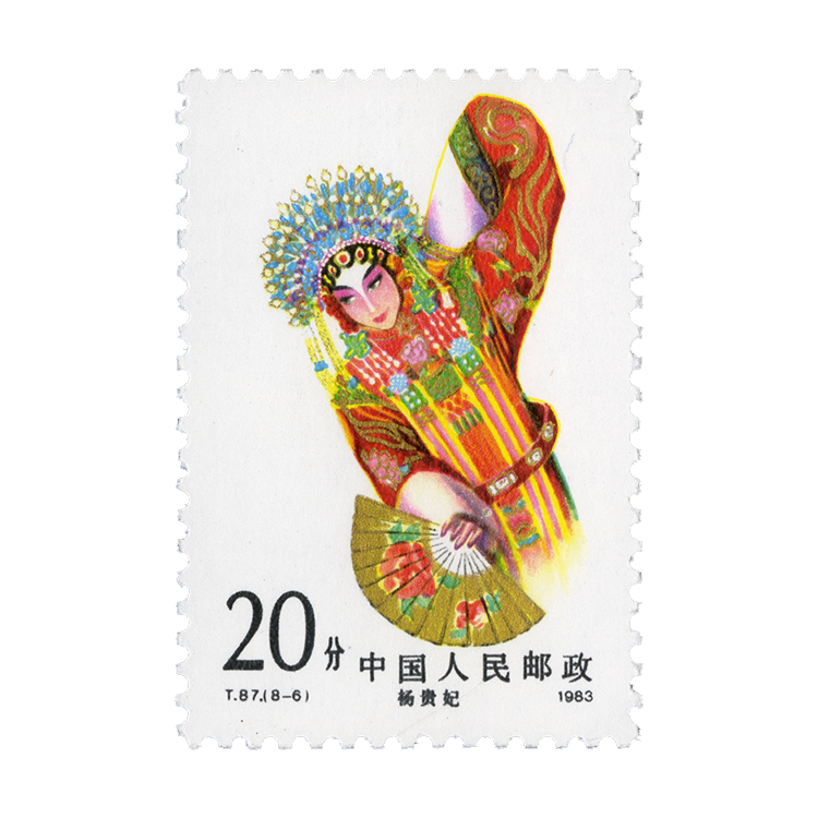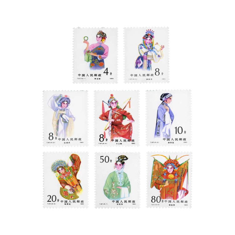 这套邮票通过京剧中的旦角这一侧面反映了京剧在造型、角色分配等方面的特色。设计者李为运用水粉画技法,选取剧情中有代表意义的场面作为其设计的依据,可谓形神兼备,寓复杂的剧情于方寸之中。