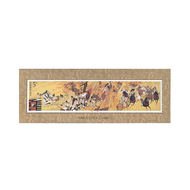 小型张为“赤壁鏖兵”。选自第四十九回“七星坛诸葛祭风 三江口周瑜纵火”。描写孙、刘联军三万人于赤壁击败曹操八十万大军,从此确立了三国鼎足的局面,小型张在设计上打破了时空界限,以连环画形式将“借东风”,“水战”不同场面融为一体。画面上左侧孔明身披八卦道衣,作道士打扮,仗剑借东风使火势向右边烧去;中间熊熊烈焰中“先锋黄盖”大旗下,东吴老将黄盖在率众冲杀;右侧曹魏的人马慌乱的情景。