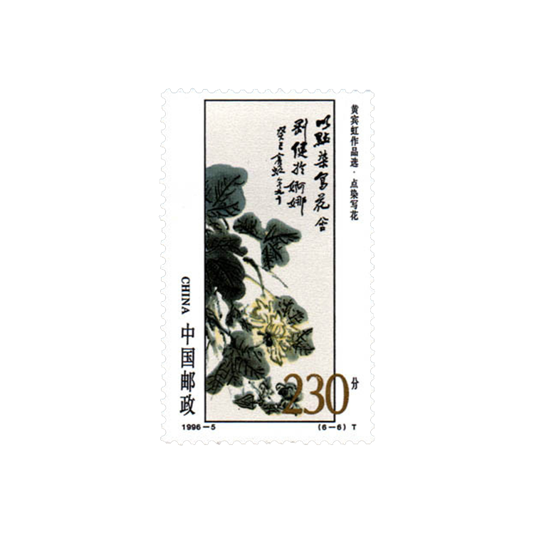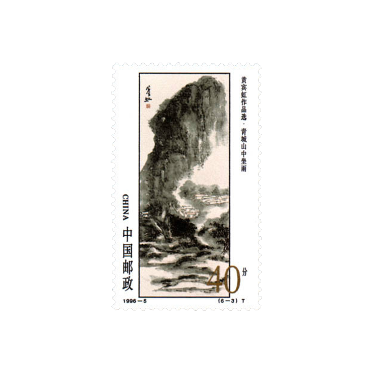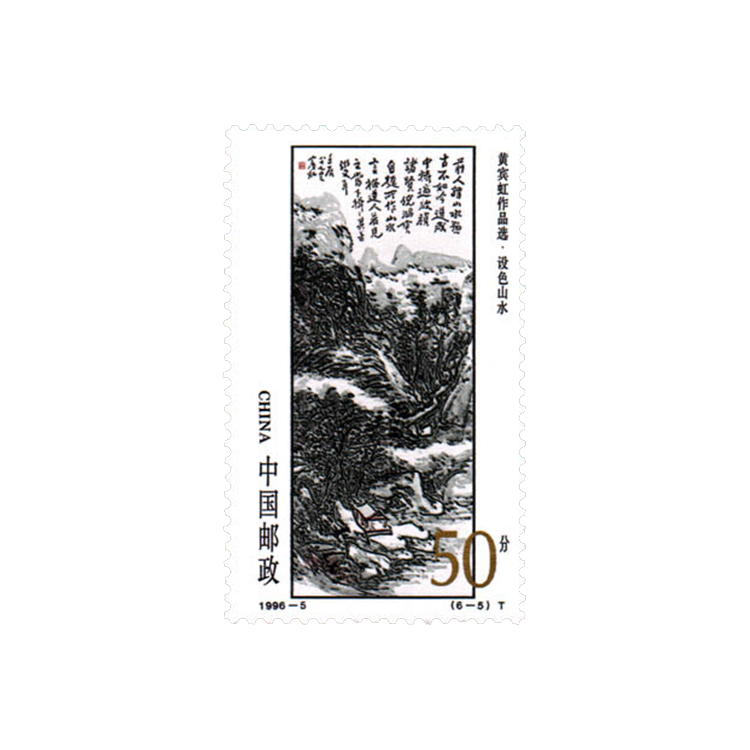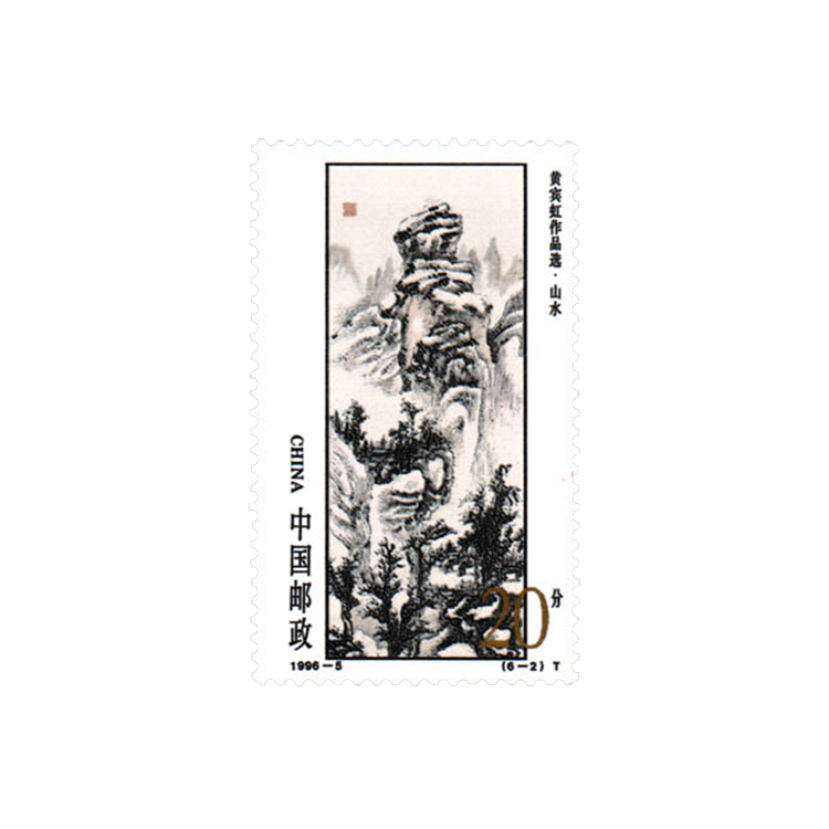 每到一地,他都以诗画记述,写生纪胜,积稿盈万,真实地描绘了祖国的名山大川,烟云胜景。他以其精湛的技艺同齐白石齐名,享有“南黄北齐”之称。不仅如此,黄宾虹对于画论画史颇有研究,见解精辟,著有《虹庐画谈》、《中国画学史大纲》、《画学篇》、《黄山画家源流考》、《吉画微》、《宾虹草堂藏印》等,另有辑本《黄宾虹画语录》,并与邓实合编《美术丛书》。黄宾虹能诗文,善书法,兼治金石文字、篆刻之学,精鉴赏,也作花鸟草虫,奇倔有致,对画论、画史自有其独特探究,人格高尚,多才多艺,一生中从未以此为个人谋取名利。他认为“中华大地,无山不美,无水不秀,”,故其作画是以画寄情,以情报国。全国解放时,他已86岁高龄,仍出任中央美术学院民族美术研究所所长和中央美术学院华东分院教授之职,并被选为中国人民政治协商会议第二届全国委员会委员、中国美术家协会理事和华东分会副主席。在他90寿辰时,华东行政委员会颁发荣誉奖状,称他是“中国人民优秀的画家”,赞扬他热爱祖国,不媚古人,不落俗套,为继承绘画传统,弘扬民族艺术做出卓越贡献。1955年3月25日,黄宾虹先生因息胃癌医治无效,在杭州与世长辞,享年92岁。家属秉其遗愿,将所藏书籍、字画、金石拓本以及自作书画、手稿等1万余件全部捐献国家。在其栖霞岭故居,国家为之建立了“画家黄宾虹纪念室”。“一生九十笔愈老,千军为扫万马倒”。为纪念这位伟大的人民画家,邮电部发行了这套《黄宾虹作品选》特种邮票。所选作品,1幅书法、1幅花卉画、4幅山水画,均是画家的代表之作,表现了他那深厚的创造力和大气磅礴的艺术气质。设计者以白色衬底,饰以细线框,“中国邮政”和邮票名称均采用黑色宋体字,面值则为金色,以造成一种清新明快的视觉效果,为原作营造出雅致而大气的氛围。