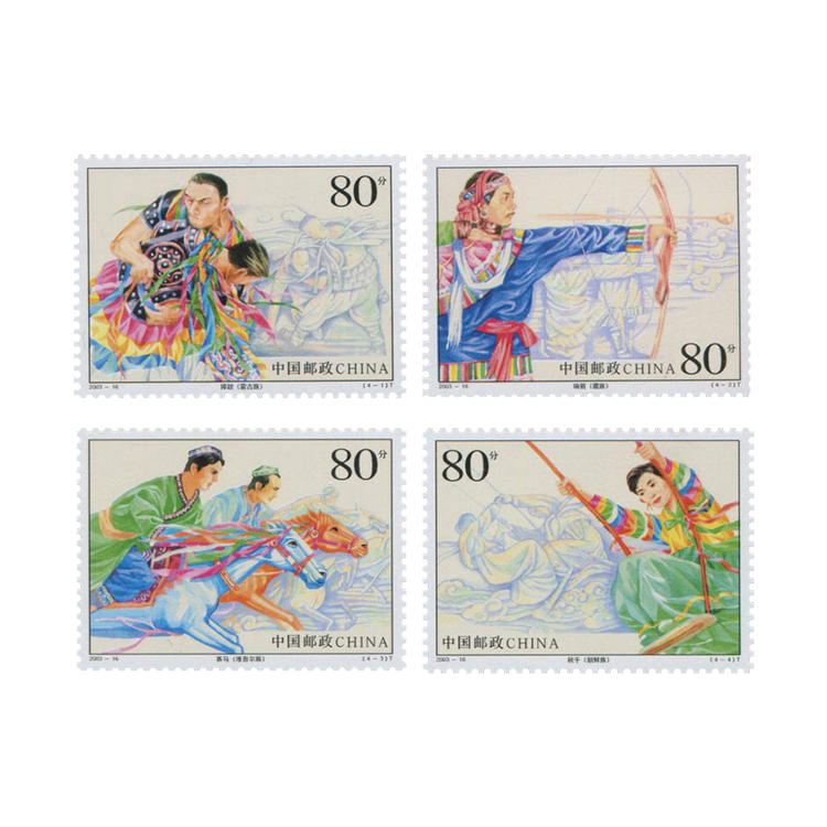 2003年9月5日,为了祝贺第七届全国少数民族传统体育运动会和展示丰富多彩的民族传统体育运动,国家邮政局发行了《少数民族传统体育运动》特种邮票,全套4枚,小全张1枚,同时发行小版张1套2版。