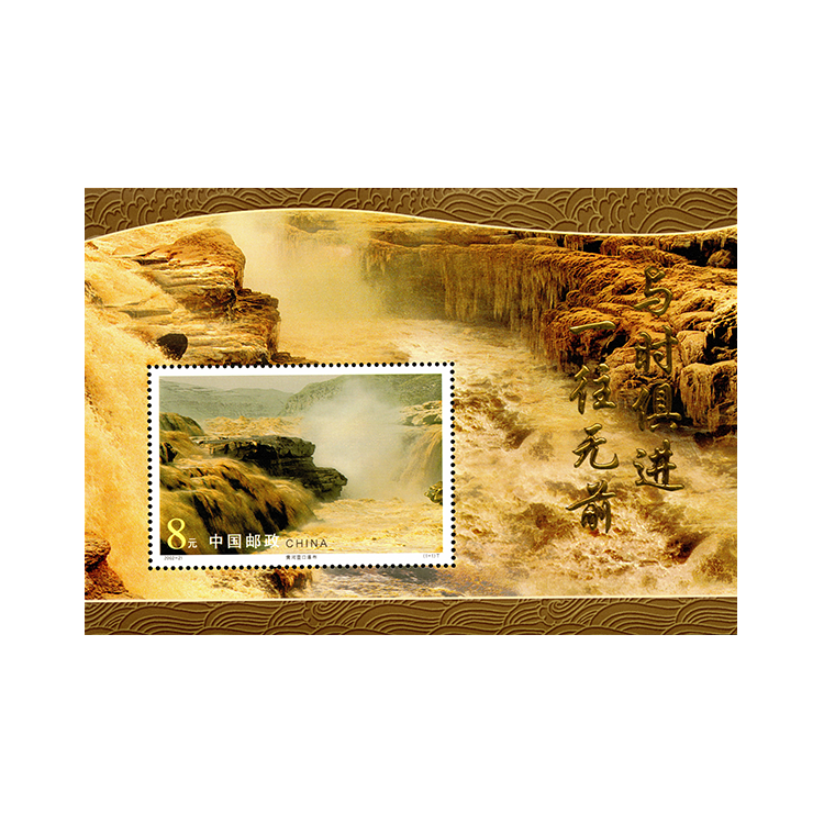 邮票主图为黄河壶口瀑布。壶口瀑布在山西吉县西南25公里处,为我国第二大瀑布,世界上最大的黄色瀑布。黄河巨流一路奔腾,在山西和陕西交界处曲折南流,到山西吉县与陕西宜川一带,被两岸苍山挟持,约束在狭窄的石谷中。千万年以前,这里地壳发生运动,使岩石断裂,在河津的龙门一带形成断层,导致出现壶口地形。河水在平整的谷底冲蚀出一道深槽,其宽不过三五十米,深约50米。滚滚黄河到此由300米宽骤然收束到深槽之中,不禁倾泻而下,形成落差达50米的大瀑布。“悬注潆旋,有若壶然”,《禹贡》上亦记载道:“盖河旋涡,为一壶然,故名”。