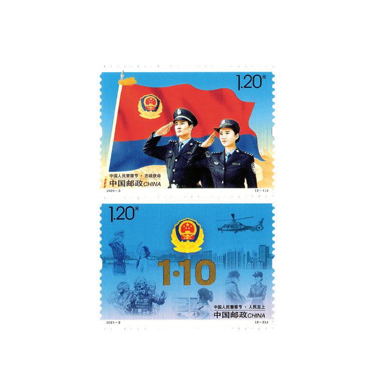 《中国人民警察节》纪念邮票分别以警旗、警徽图案和警察节日期为主要设计元素,以“忠诚使命”和“人民至上”为主题,充分体现了公安机关践行习近平总书记在中国人民警察警旗授旗仪式上的重要训词精神,牢记初心使命、勇于担当作为,坚决捍卫国家政治安全、维护社会安定、保障人民安宁的坚强信心和决心,生动描绘了公安民警为增强人民群众获得感、幸福感、安全感努力工作的战斗场景,艺术刻画了人民警察爱岗敬业、一心为民、无私奉献的良好形象。