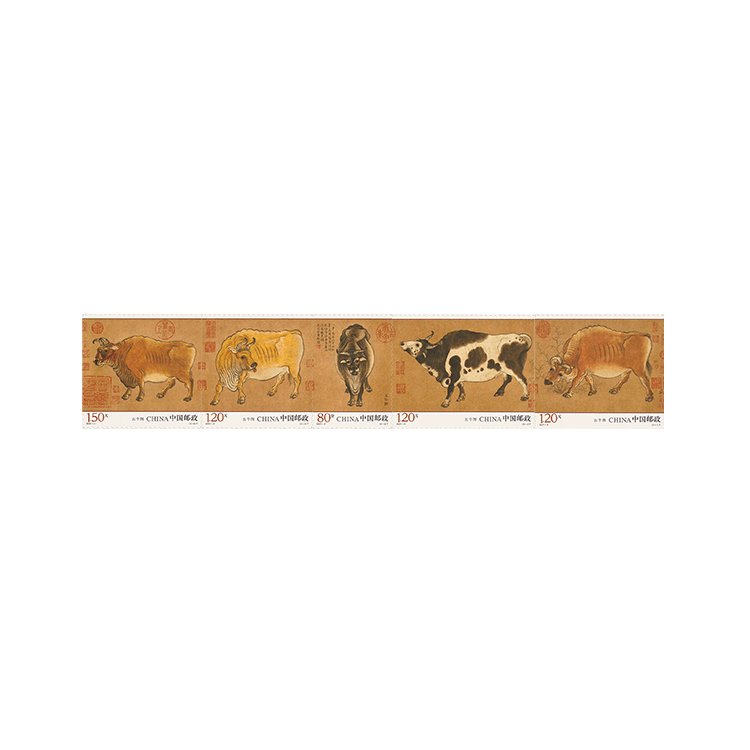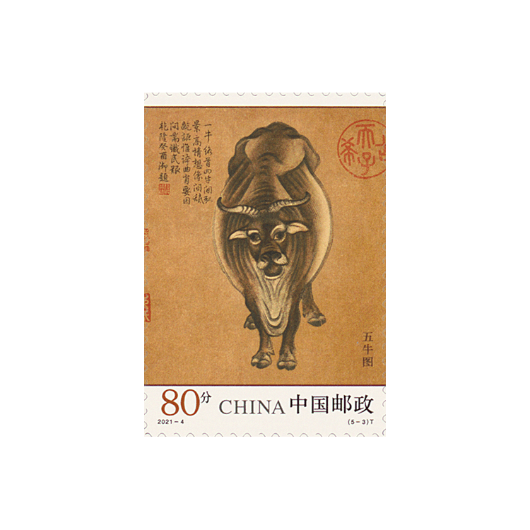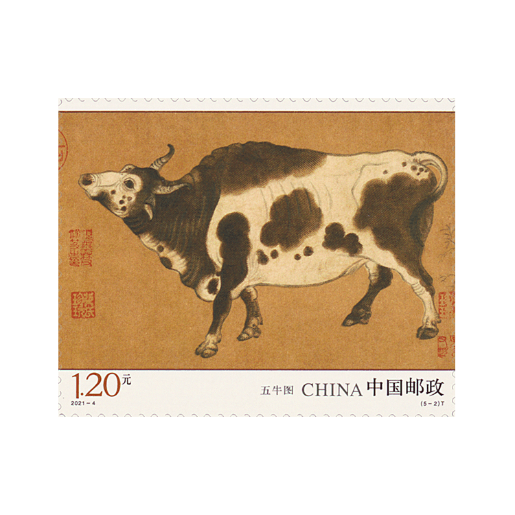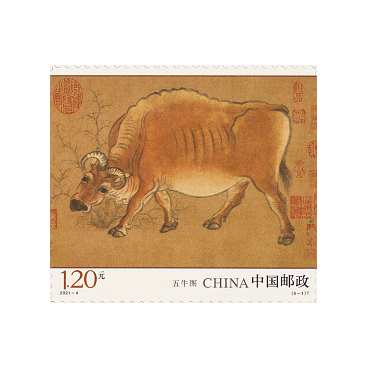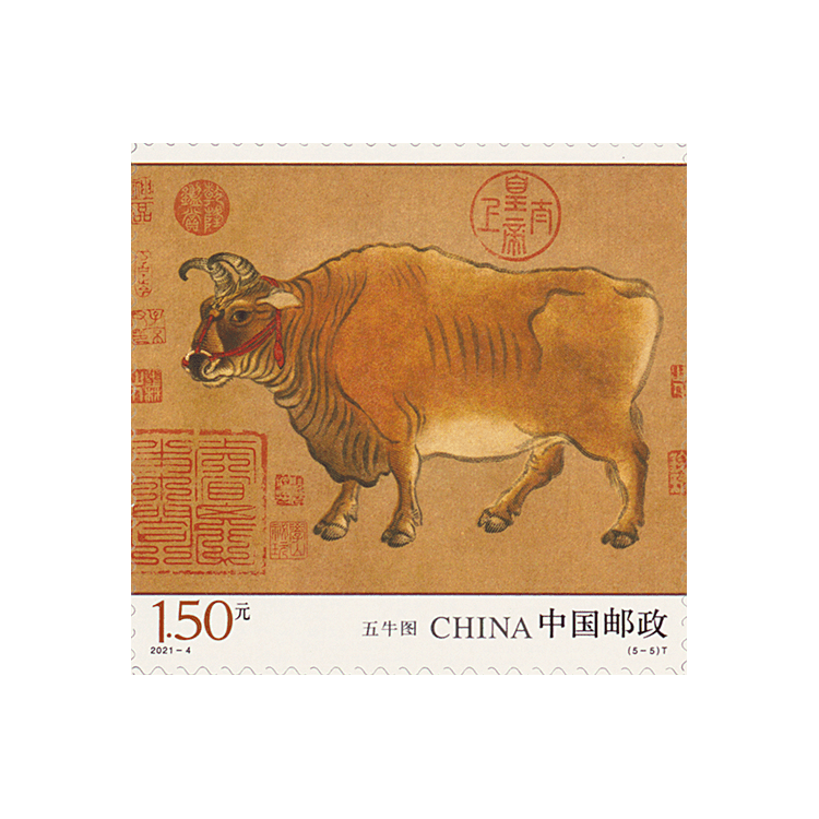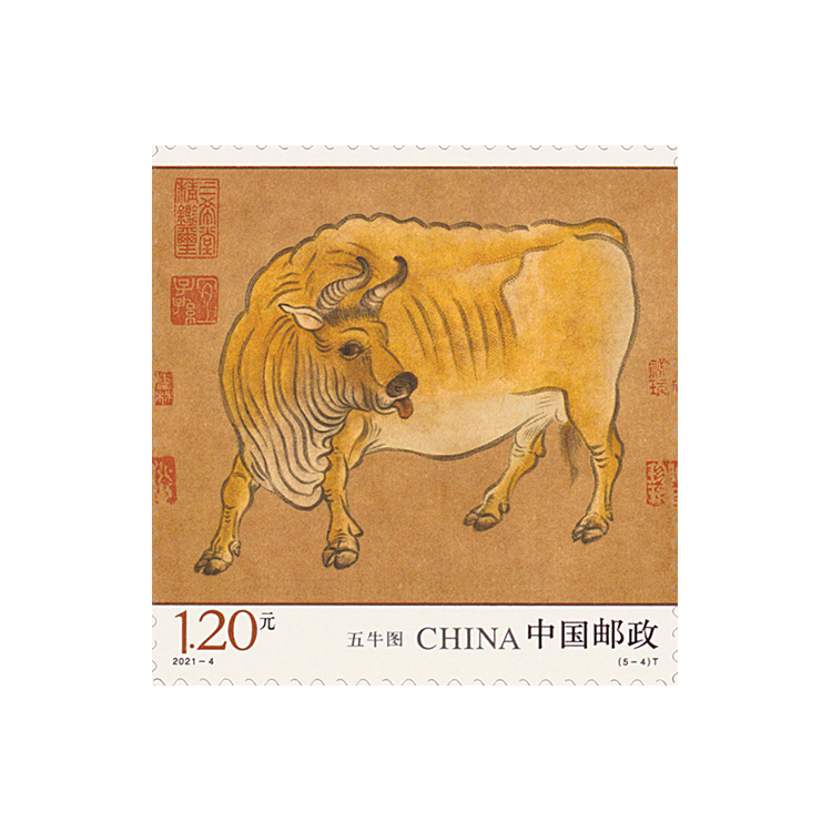中国邮政定于2021年3月20日发行《五牛图》特种邮票一套5枚,小型张1枚。