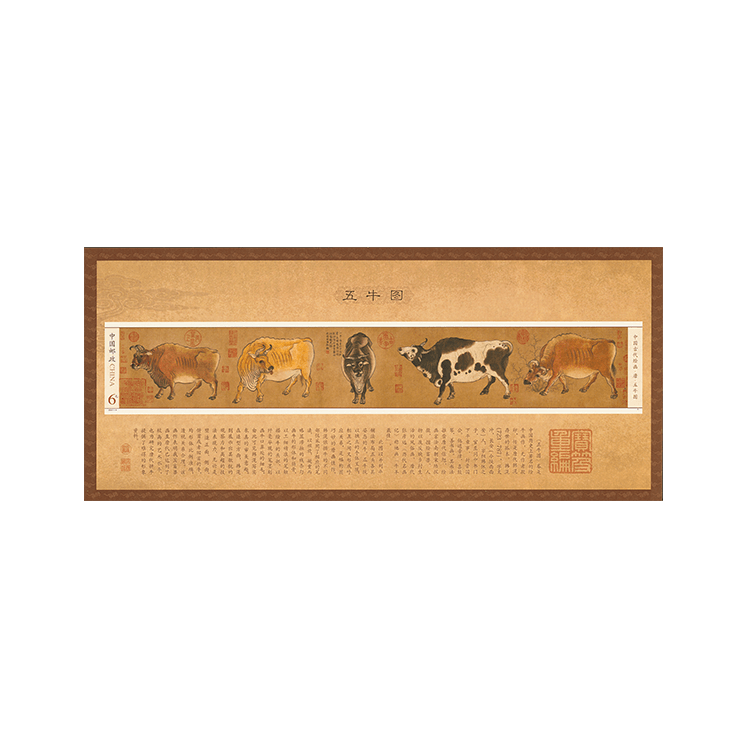 该套邮票根据五头牛在原画中的布局采用多样化的票幅设计,小型张则采用大规格票幅,充分展示出五头牛各具状貌、姿态互异的特色。整体设计古朴典雅,邮票微雕模切齿孔工艺与小型张无齿孔设计相结合,在方寸间重现了《五牛图》细腻精微、形神兼备的艺术特色。该套邮票由王虎鸣设计,河南省邮电印刷厂印制,邮票采用机制宣纸材料印制。