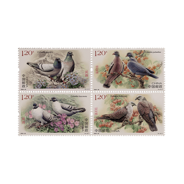 中国邮政定于2022年11月5日发行《鸽》特种邮票一套4枚,邮票图案名称分别为岩鸽、斑尾林鸽、雪鸽、斑林鸽。全套邮票面值4.80元。