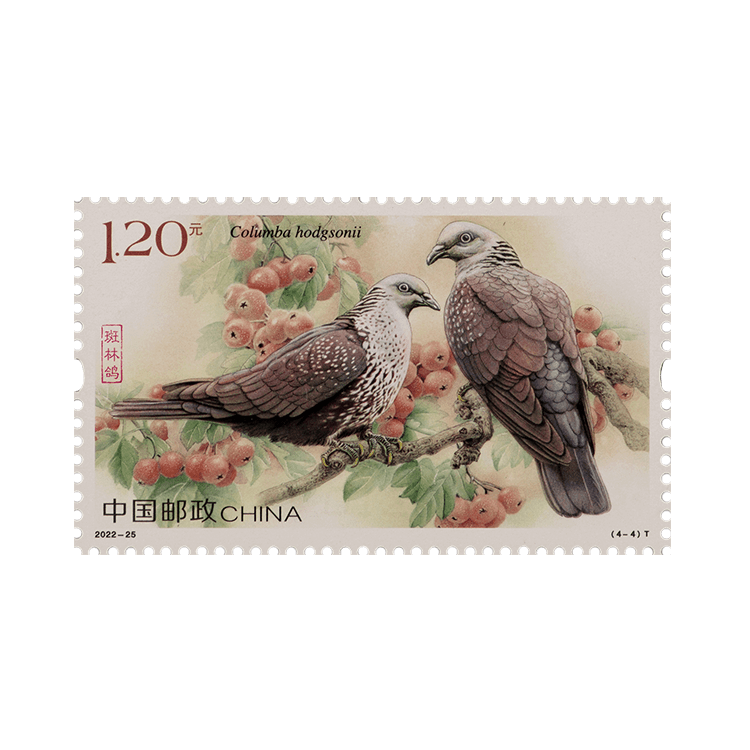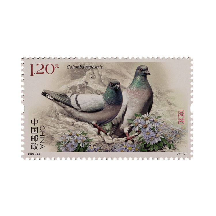 鸽子在分类上属于鸟纲鸽形目鸠鸽科,中国野生鸽属鸟类共有10种,本套邮票展示了其中的四种,即岩鸽、斑尾林鸽、雪鸽、斑林鸽。图稿以动物科学画的方式,对鸽子的生境、形态进行了细致的描摹,逼真地呈现出了四种鸽子在野外的生活状态,并充分展露了所绘鸟类的自然与和谐之美。