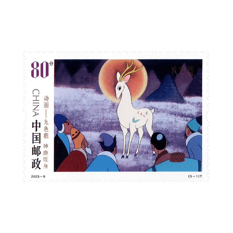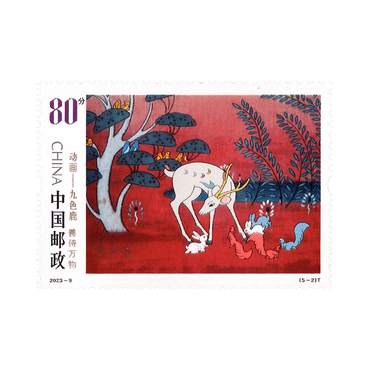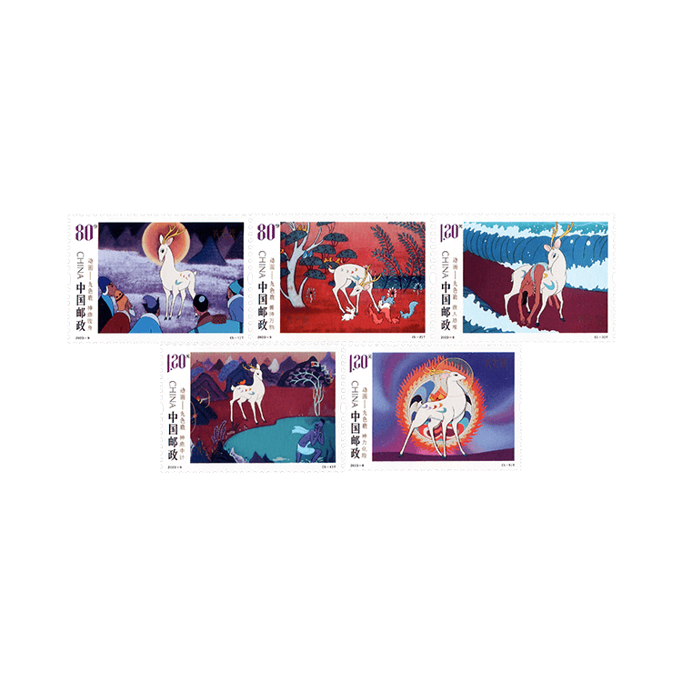 中国邮政定于2023年6月1日发行《动画——九色鹿》特种邮票1套5枚,邮票图案名称为神鹿现身、善待万物、救人劫难、神鹿中计、神力化险。全套邮票面值5.20元。