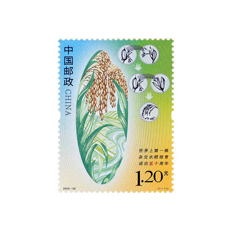 中国邮政定于2023年10月25日发行《世界上第一株杂交水稻培育成功五十周年》纪念邮票一套1枚,邮票图案名称为世界上第一株杂交水稻培育成功五十周年,全套邮票面值1.20元。