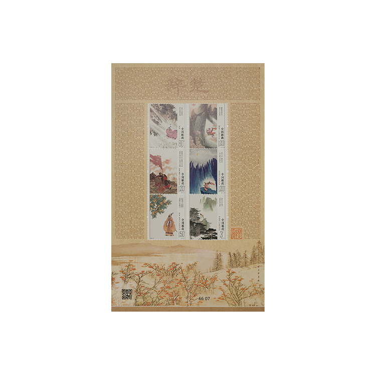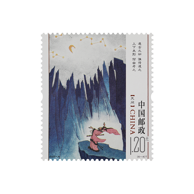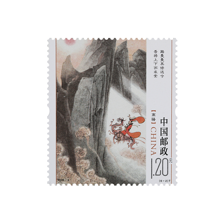 《楚辞》是中国文学史上第一部浪漫主义诗歌总集,它开创了中国浪漫主义文学的诗篇,几乎每个中国文学领域和各种不同体裁的文学,都不同程度地“嵌”有《楚辞》的身影,从中汲取精神与艺术的滋养。它不仅对我国文学发展有着极其深远的影响,更是将屈原的求索精神与家国情怀深深融入了华夏文明绵延不断的血脉之中,成为一代代中华儿女上下求索之路的精神典范。该套邮票采用中国传统绘画的表现形式,将经典语言与当代审美相融合,将工笔与写意、高远与平远等创作手法相结合,邮票画面构图舒适,设色典雅,虚实相间,意境崇高,通过色调对比,把握设计节奏起伏,使整套票充盈着旋律的韵味与楚文化的意涵。