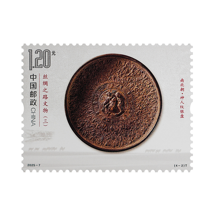 神人纹银盘出土于甘肃省靖远县北滩,藏于甘肃省博物馆,是中国丝绸之路上发现的重要罗马文物,据考证于公元四到五世纪传入中国。盘内壁满饰浮雕花纹,分三圈列置。外圈饰勾连的葡萄卷草纹,其间栖有小鸟、蜜蜂等小动物。中间一圈浮雕为古希腊奥林匹斯十二神的头像,每个头像左侧各有一只动物。中心为一高浮雕男性倚一花豹而坐。邮票采用哑沙和三维浮雕起凸工艺的融合应用,呈现银盘的细节特征和质地纹理。此件器物发现于丝绸之路甘肃段的黄河渡口,是研究东西方经济文化交流交往的重要实物资料,也是十分罕见的丝绸之路遗珍。