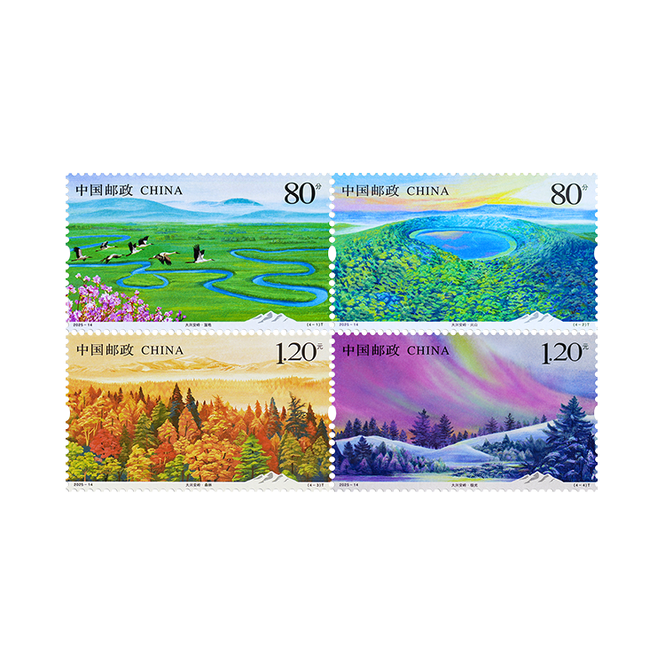 中国邮政定于2025年8月8日发行《大兴安岭》特种邮票1套4枚,邮票图案名称为:湿地、火山、森林、极光。全套邮票面值4.00元,计划发行数量为套票460万套,版式二69.3万版。