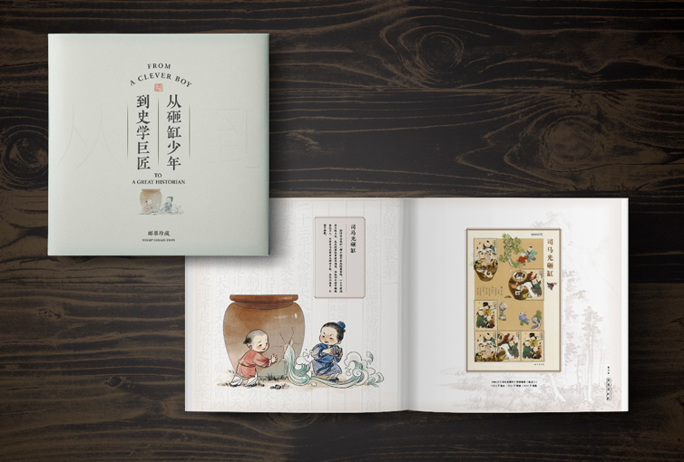 《从砸缸少年到史学巨匠》邮票珍藏册,以司马光生平、著作为主线来体现司马光为人温良谦恭、刚正不阿,为官廉政务实。