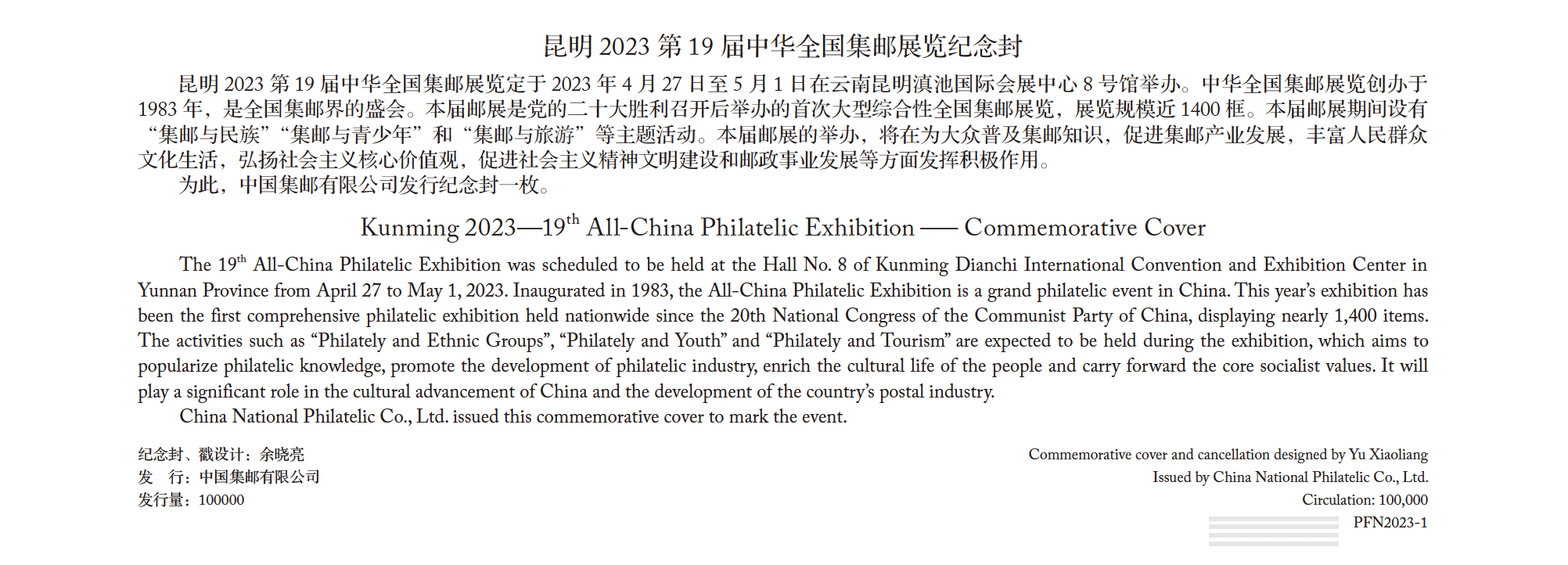 中国集邮有限公司于2023年4月27日发行《昆明2023第19届中华全国集邮展览》纪念封,编号PFN-1,一套1枚,盖销纪念邮戳。