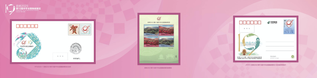 内含:昆明2023邮展纪念封1枚、昆明2023邮展邮票张1枚、昆明2023邮展邮资明信片1枚。
