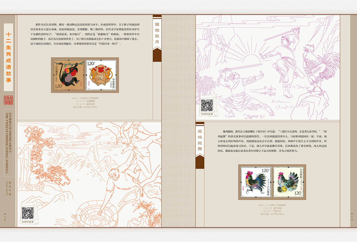 内页结合生肖邮票,图文并茂展示12个与生肖有关的成语故事。彰显成语在华夏历史文化长廊中独树一帜,堪称国之瑰宝。