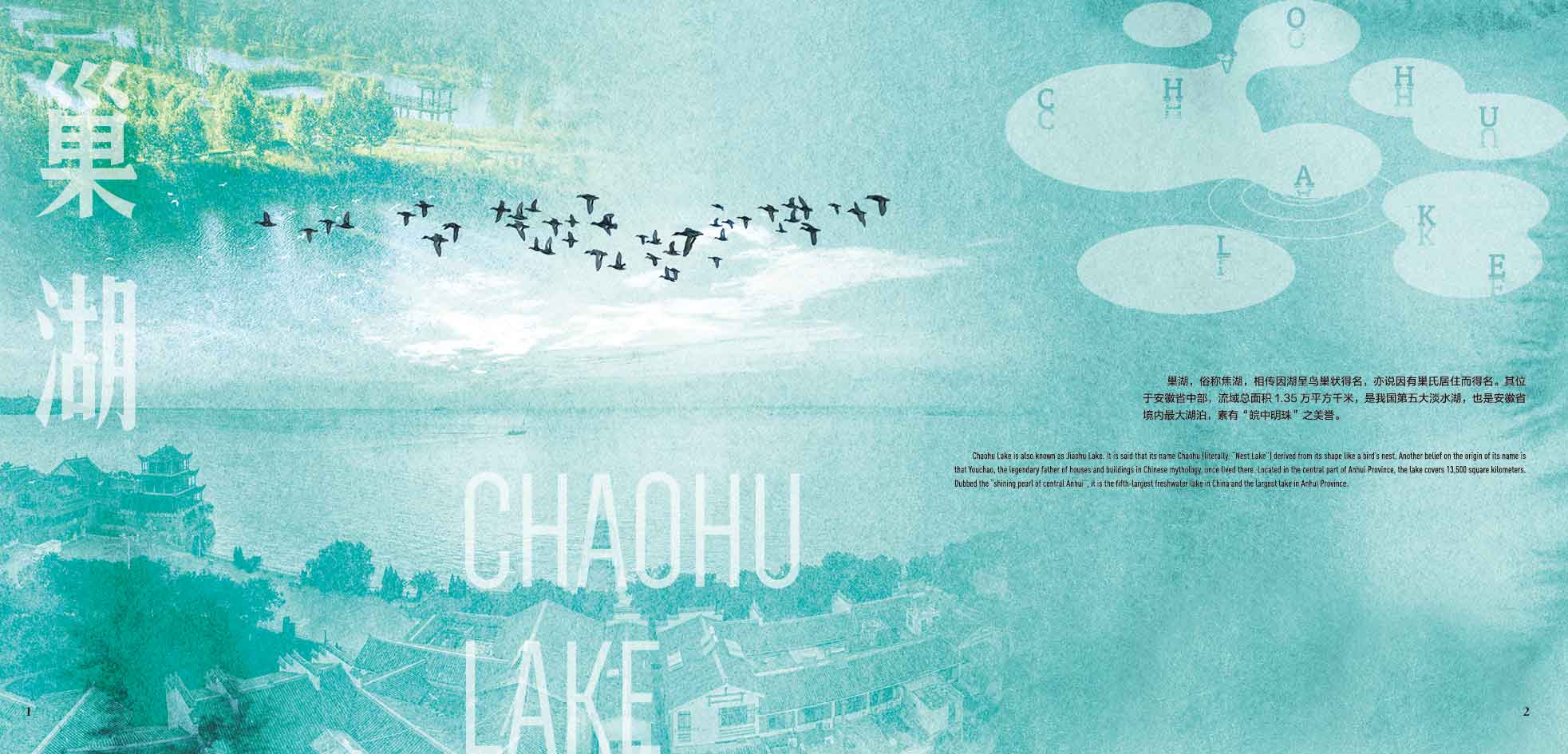以水彩画晕染的方式将巢湖自然风光融入画面,表现南方的水汽和风土人情,用椭圆形抽象组合湖泊的效果,用标题英文表现景观的倒影,增加画面的灵动的生机。
