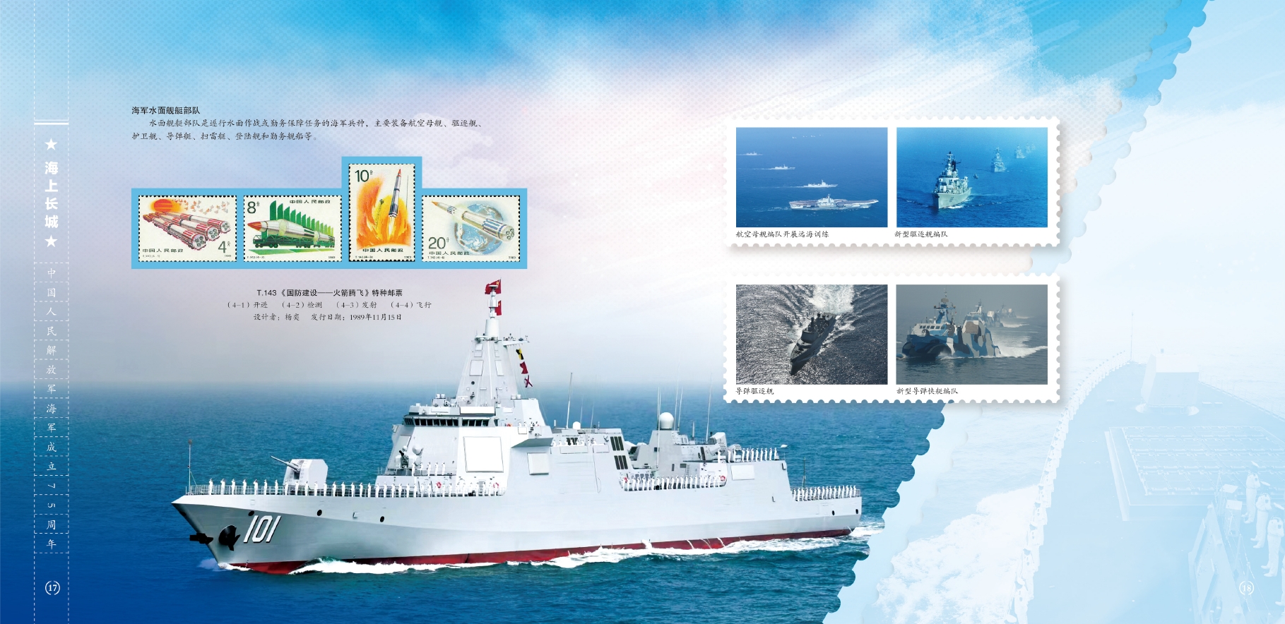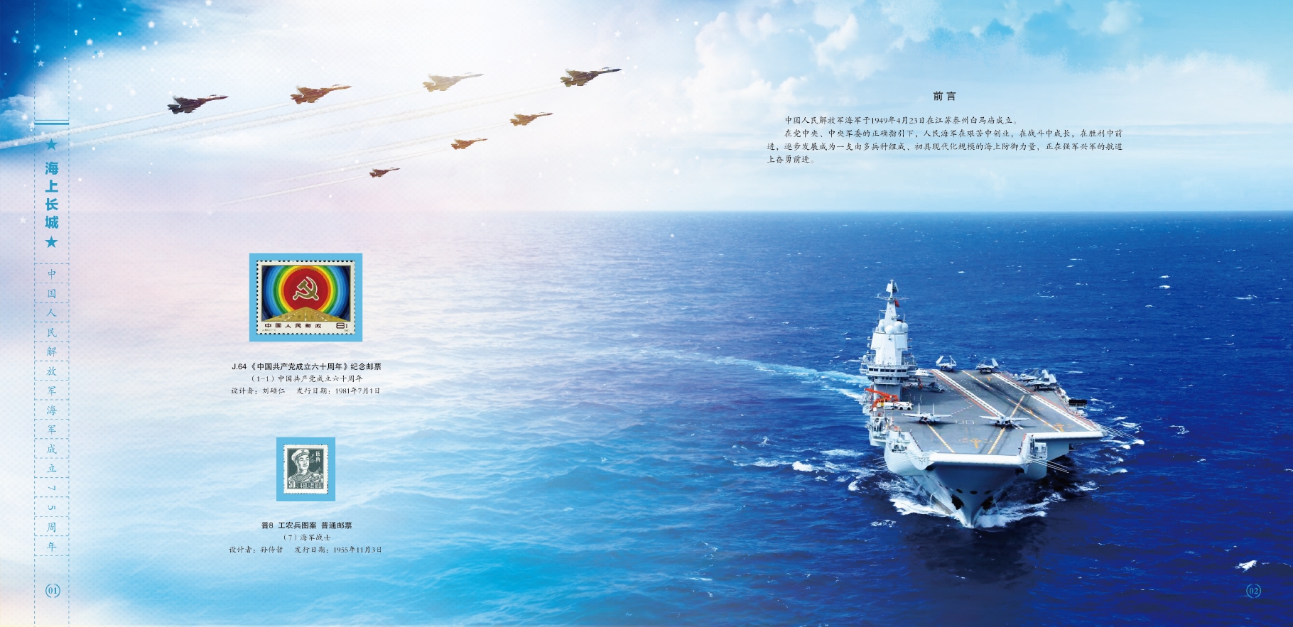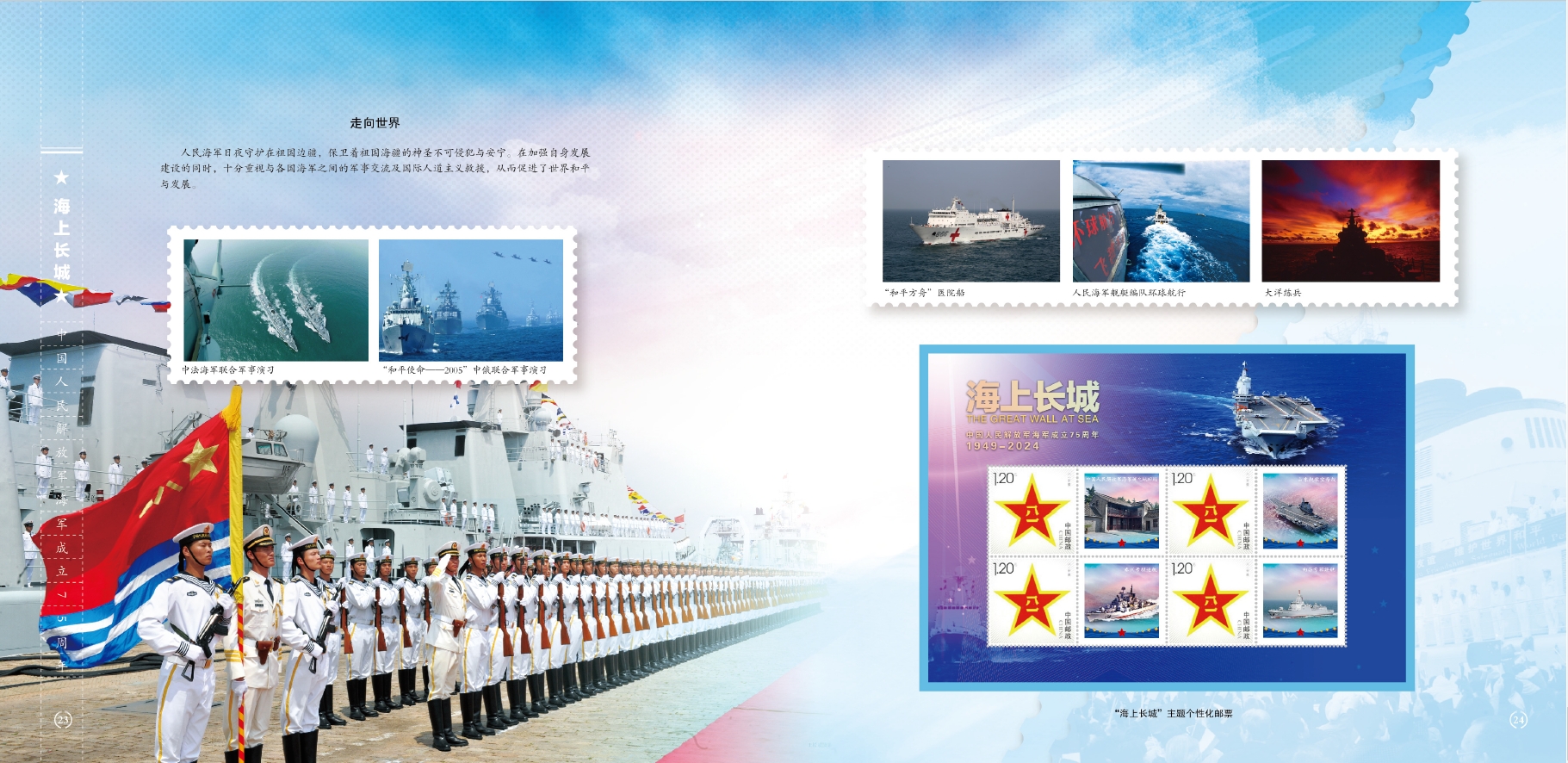 中国集邮有限公司发行《海上长城—海军成立75周年》纪念邮册一套。