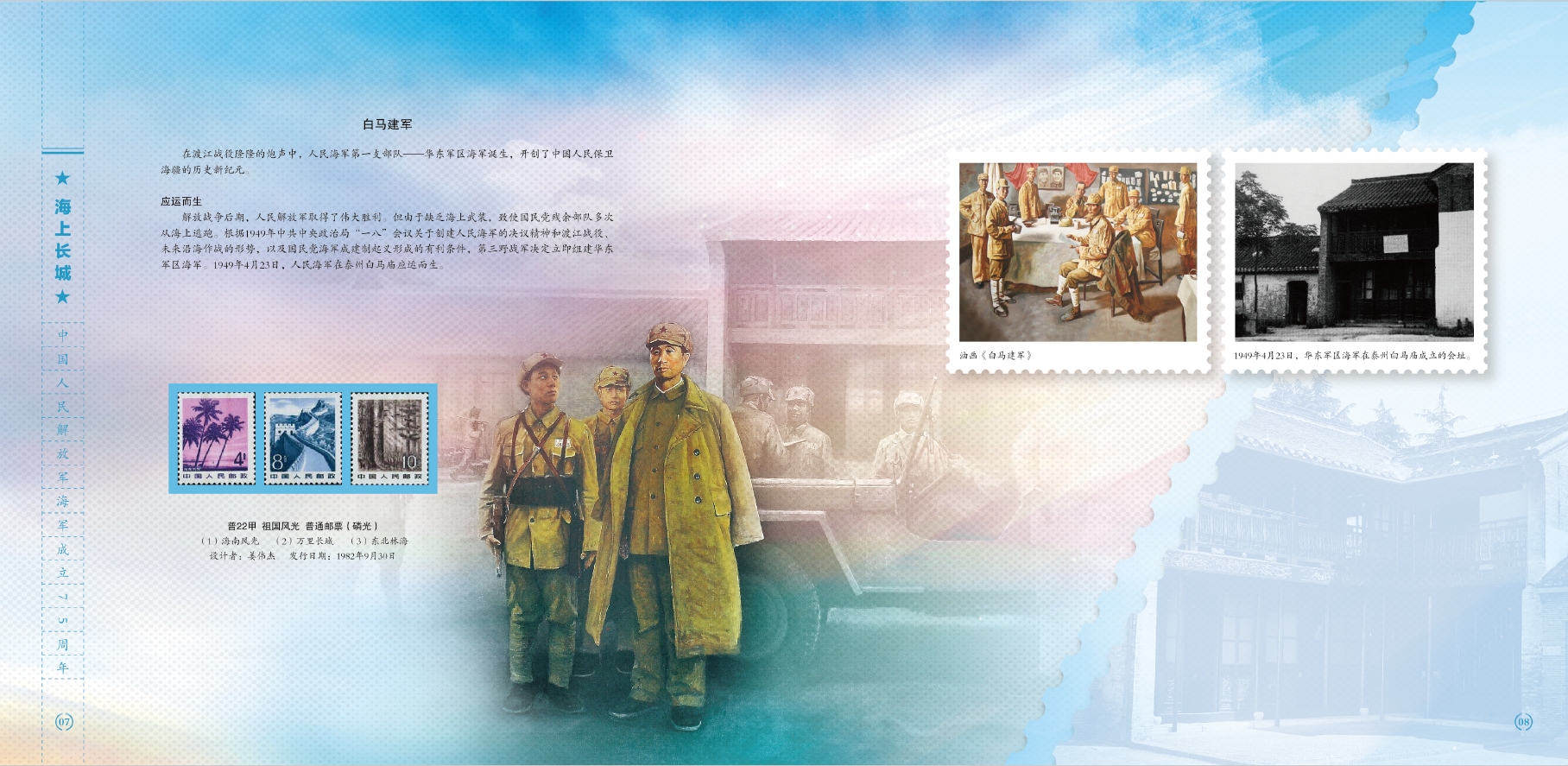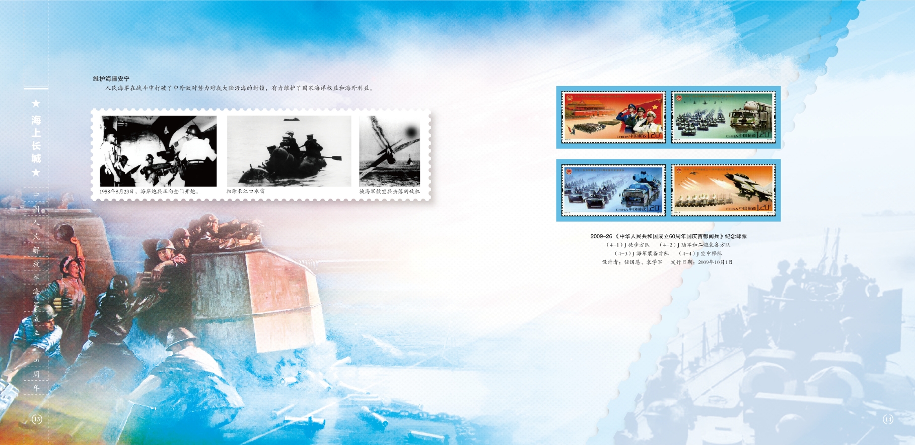 邮册中记录人民海军从白马建军、威震海疆到发展壮大、走向世界的全过程,图文和邮票相结合,权威性、知识性、收藏性于一体。