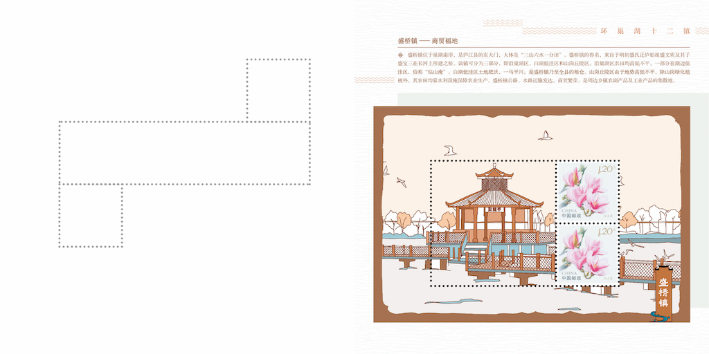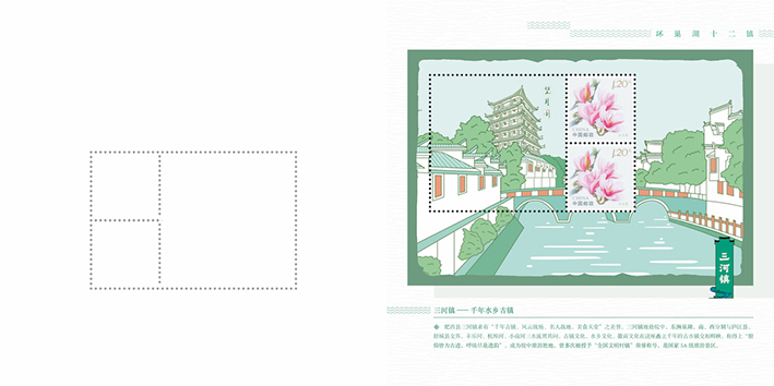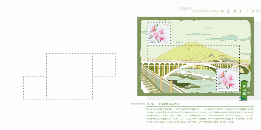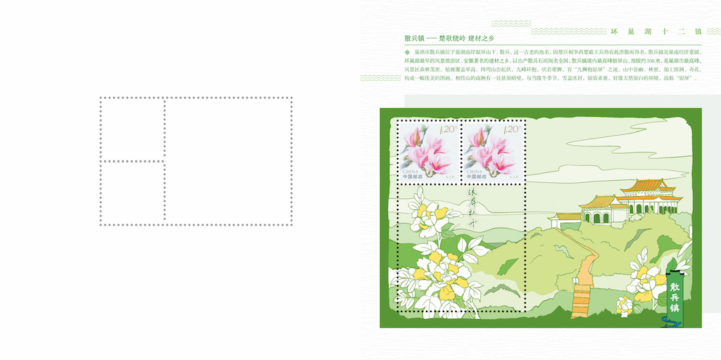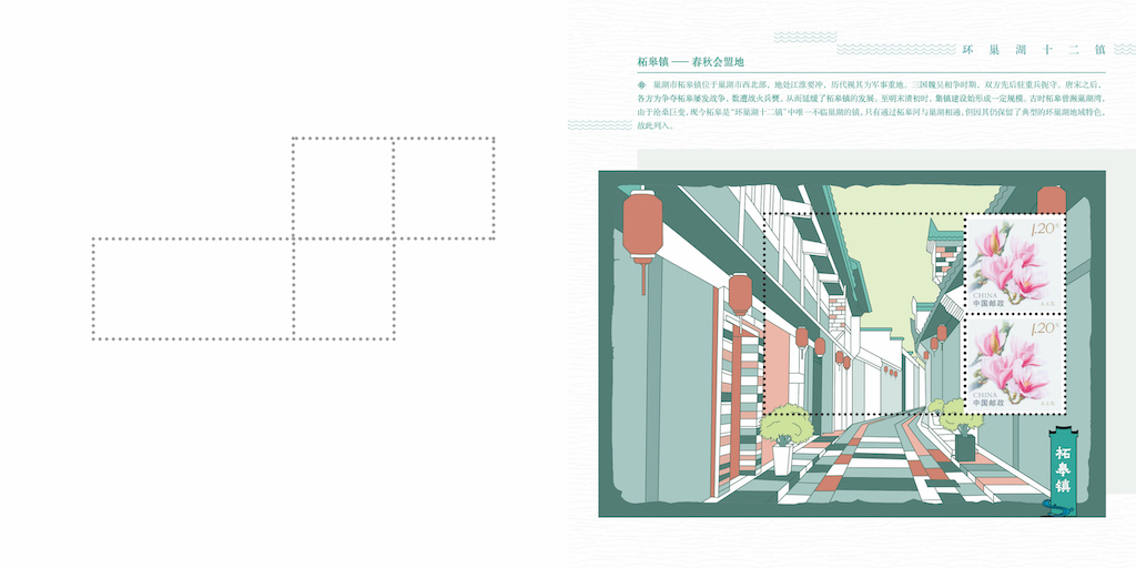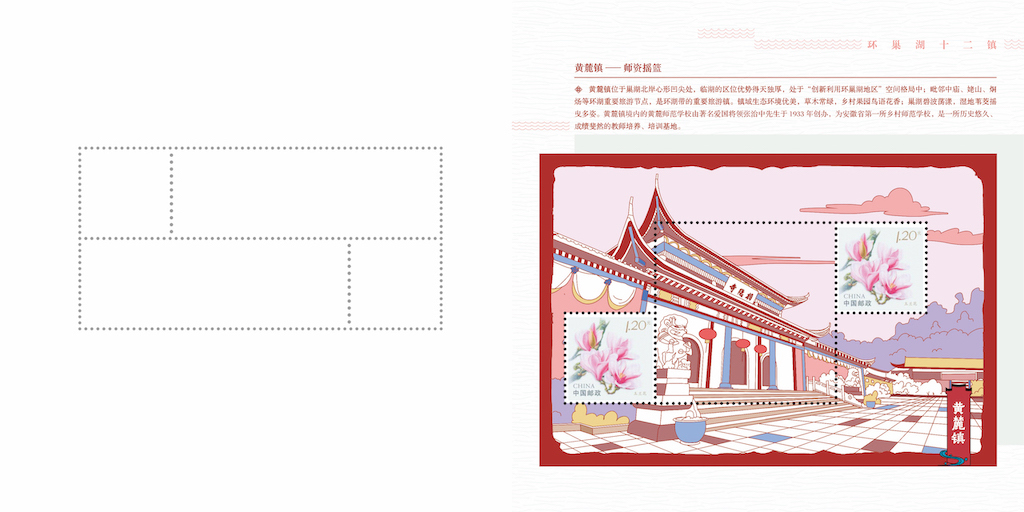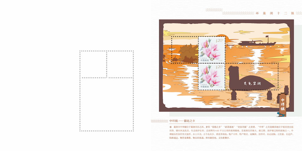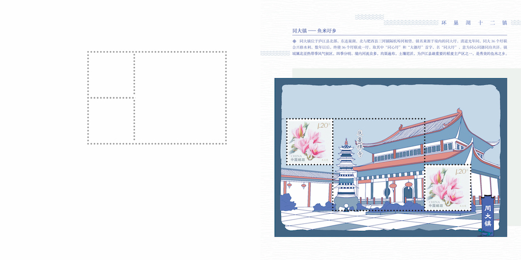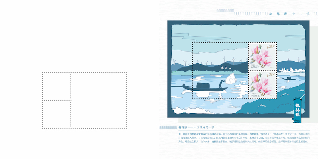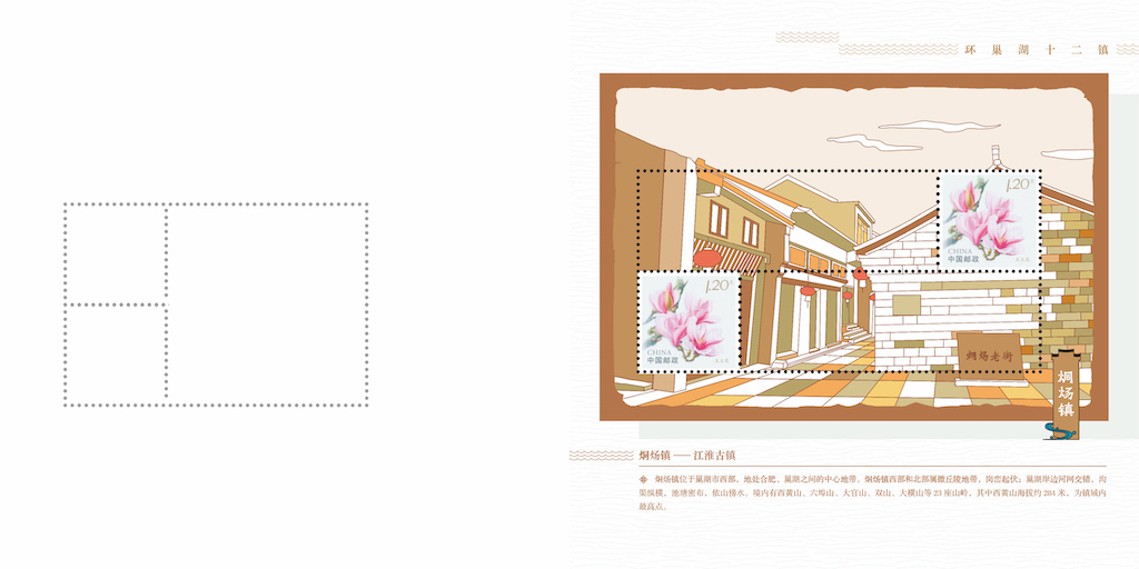 该产品旨在通过本票册这一独特集邮载体,展现出环巢湖地区十二镇的独特魅力和地方特色。设计上每镇打造一页手绘风格内容展示,配合玉兰花主图两枚版个性化邮票,充分表现该镇的风貌、自然景观、特色文化等。让人们在欣赏邮票的同时,也感受到艺术的魅力。