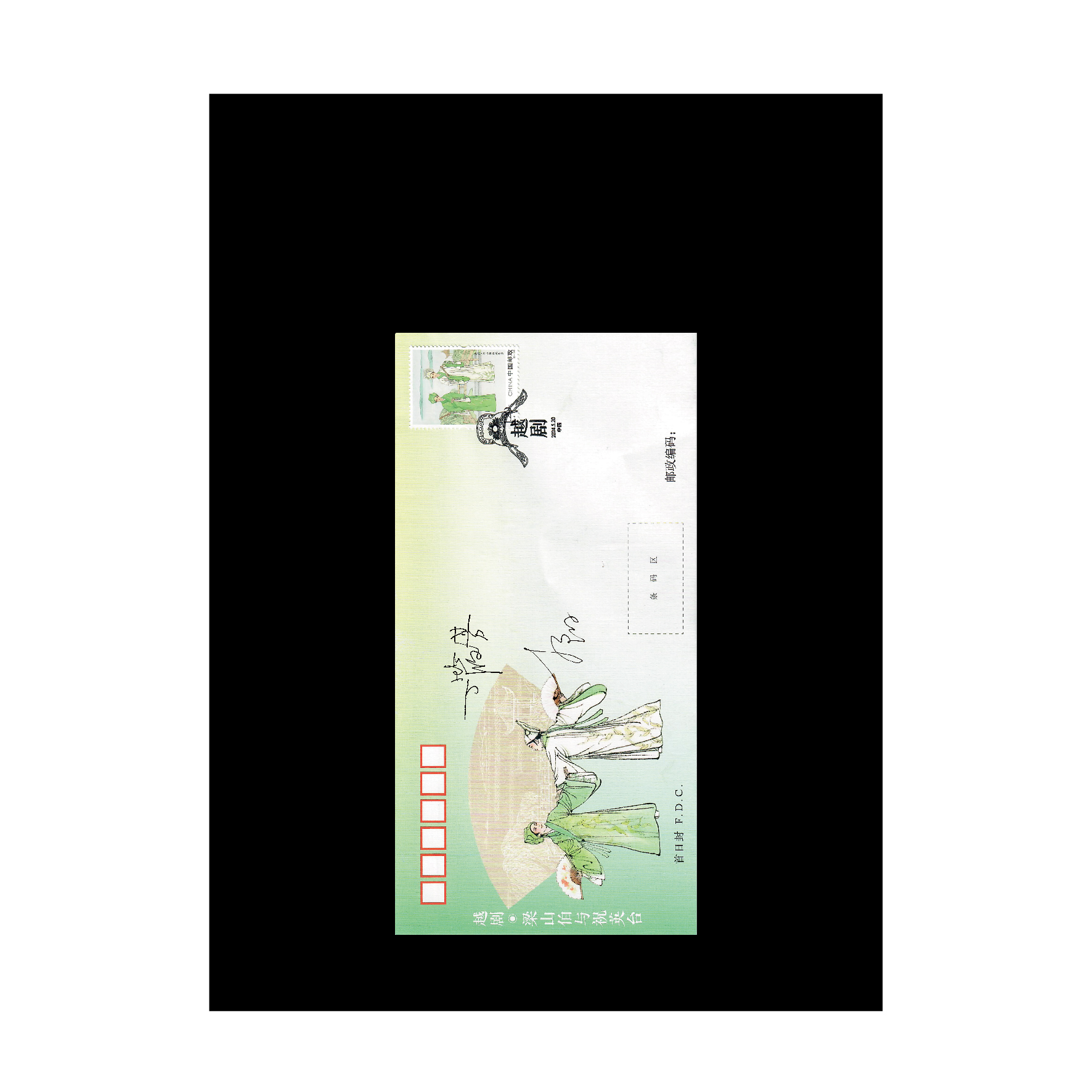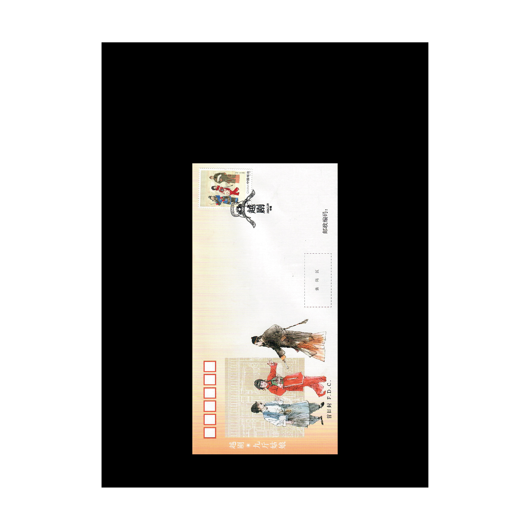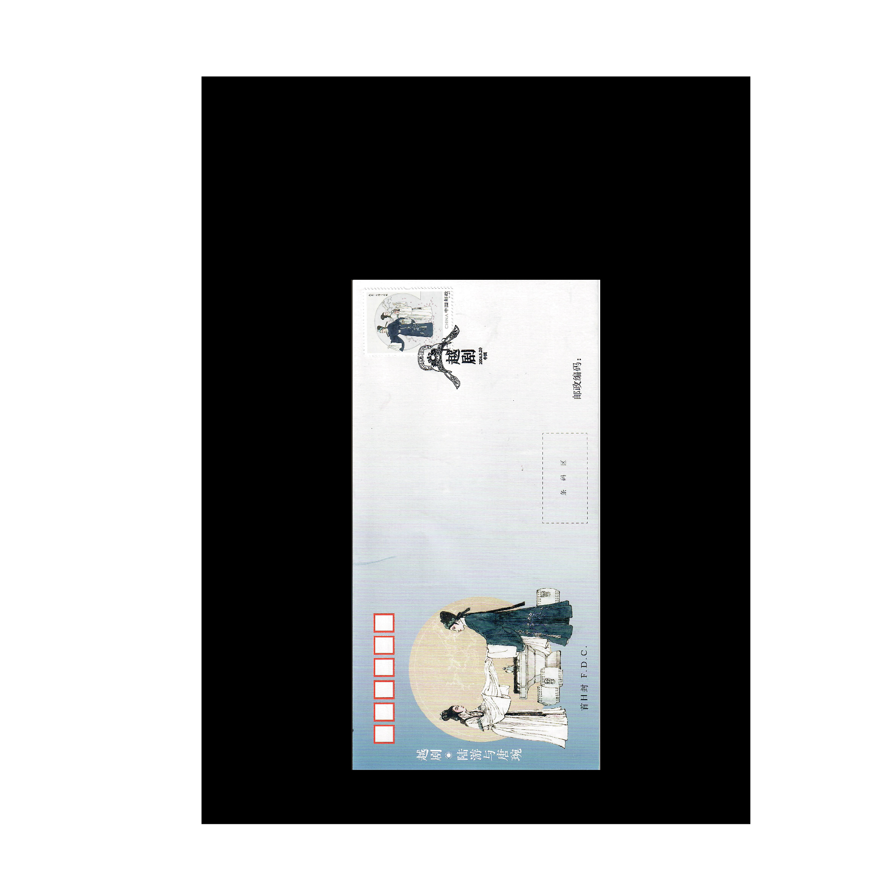 《越剧》特种邮票采用中国传统工笔设色画法,画面细腻秀美,呼应越剧柔婉娴雅的艺术风格,凸显了江南的灵秀之气,结合淡雅的背景,展现出越剧的独特韵味。邮票表现内容选取了越剧中具有代表性的三出剧目,大版边饰用剡溪、嵊州城隍庙古戏台作为装饰。剡溪象征着越剧的唱腔起源于剡溪两岸的民间小调和田头山歌,越山剡水清悠悠,回肠柔曲出嵊州;而嵊州城隍庙古戏台是众多越剧名演员向父老乡亲汇报的重要场所,也是表演艺术的检验台。