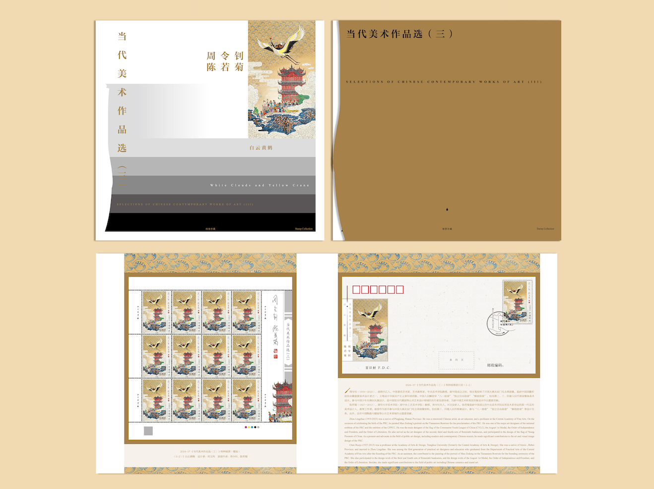 产品采用邮折形式,将三位画家的作品分为三个邮折逐一呈现,既体现三位画家的不同风格的特殊单一性,又将作品合成一套套折表现作品“选”的概念。每个邮折搭配对应画家的整版邮票和首日封。