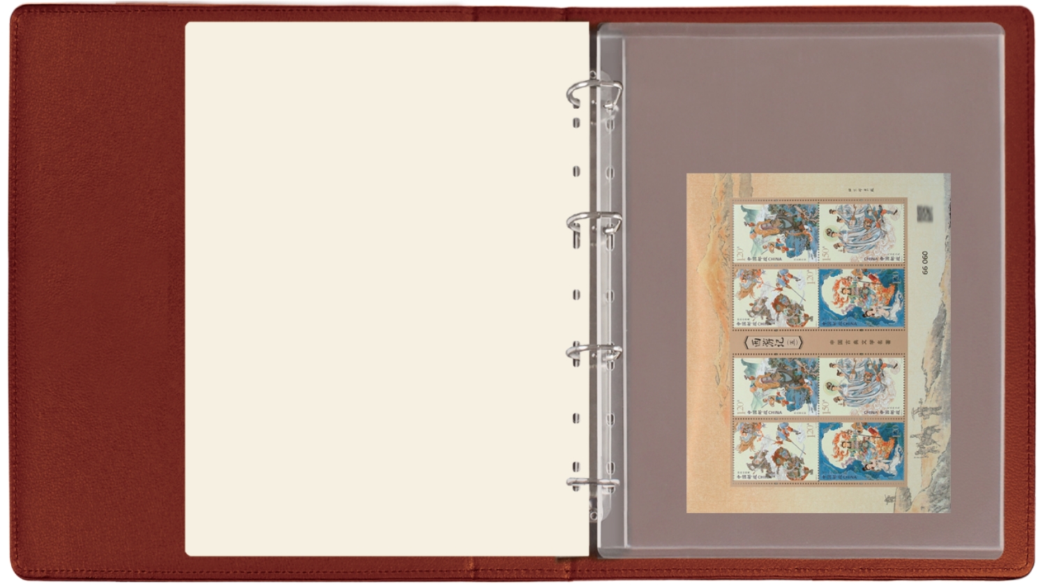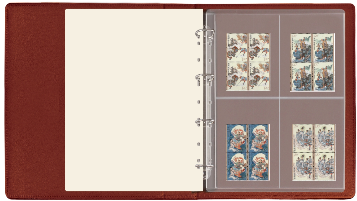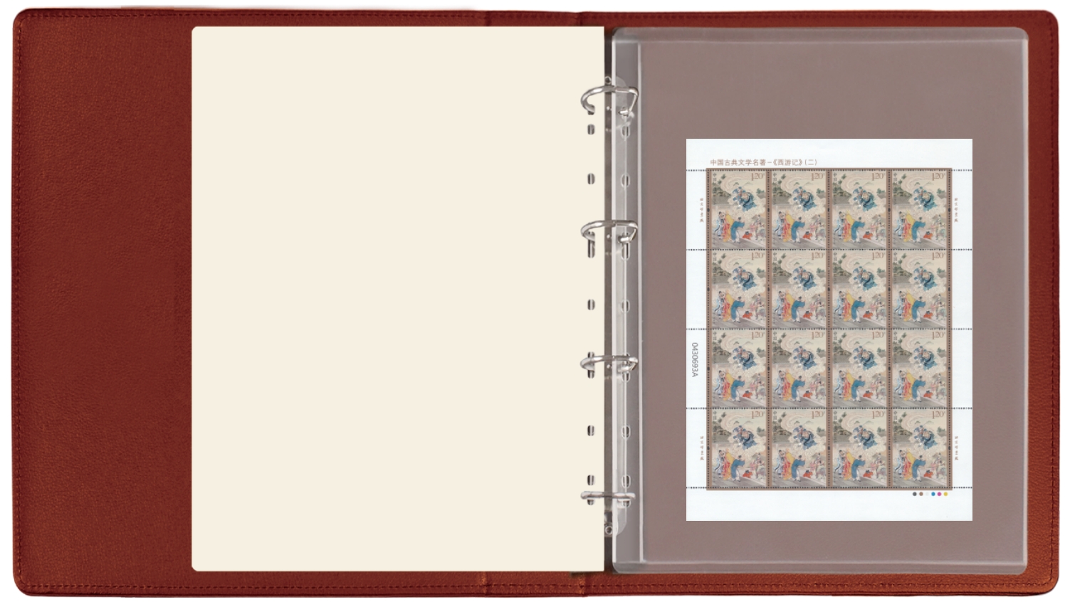产品内含中国邮政自2015年至2023年发行的《中国古典文学名著——<西游记>》一至五组邮票套票、四方连、小型张、版式一、版式二、四方连邮票折和全张邮票折,并使用精美活页册作为包装物,既便于观赏邮票,又对邮票起到很好的保护作用。