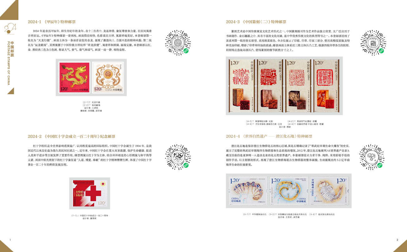 2024年全年纪特邮票套票+小型张+小本票,个性化邮票原票套票,2024-1《甲辰年》赠送版,邮票目录纪念张。