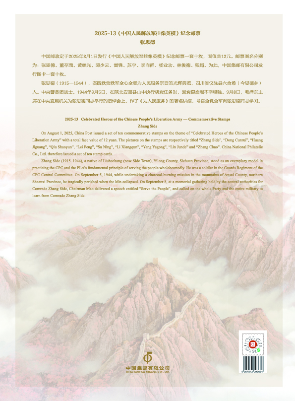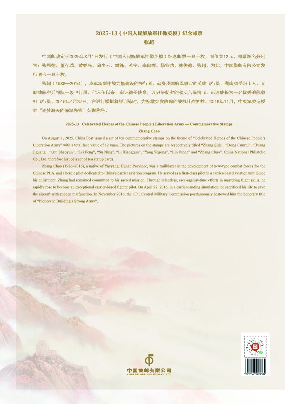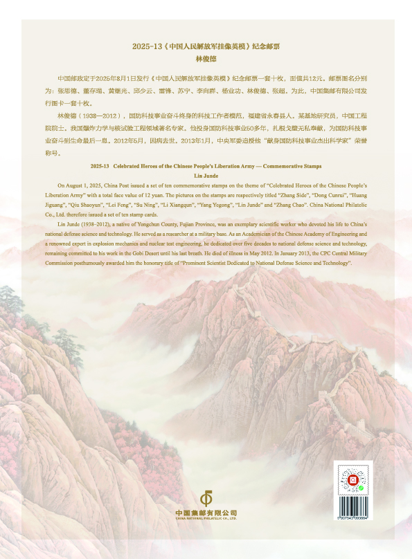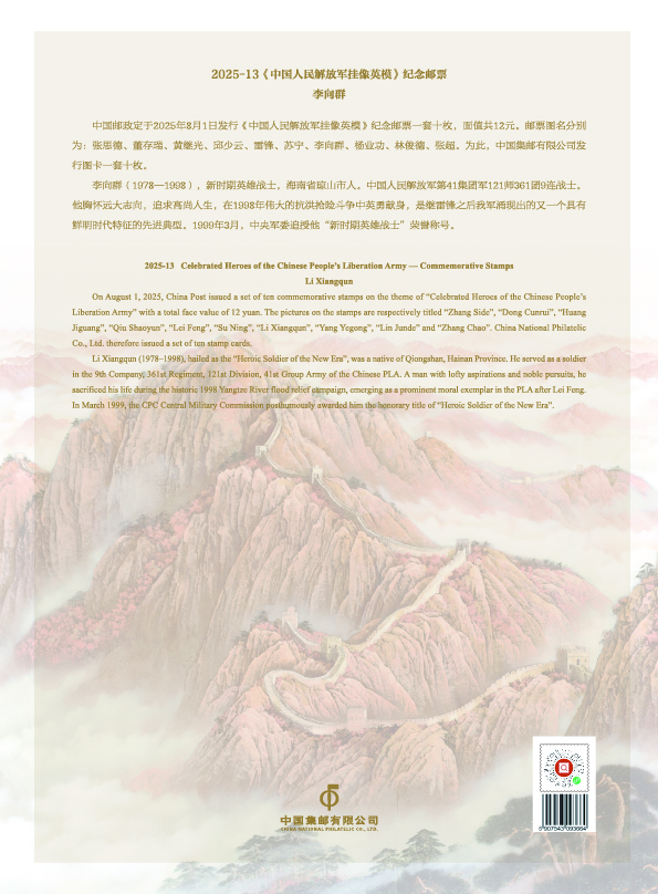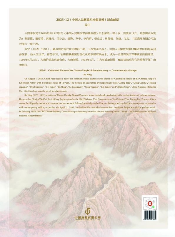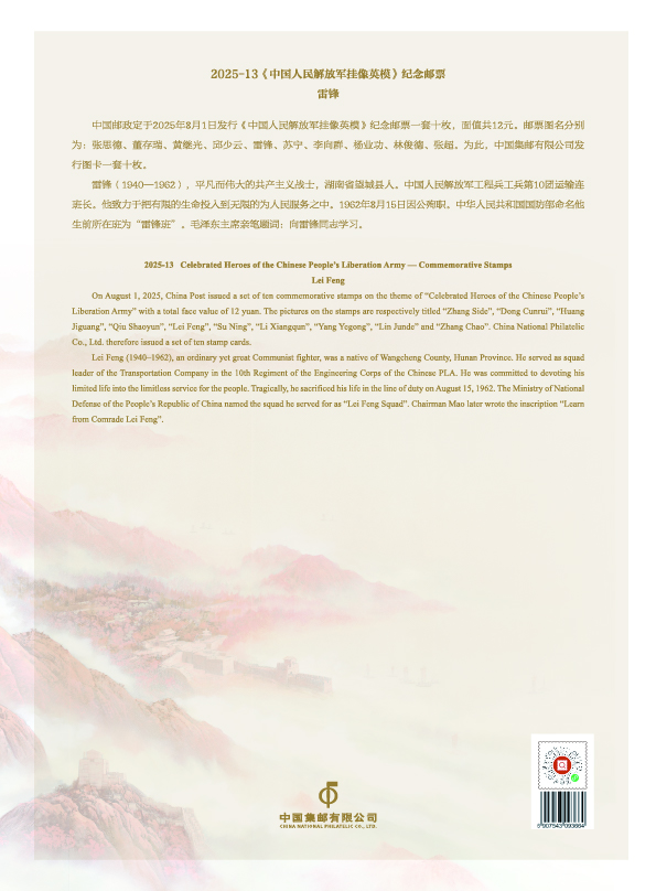 中国集邮有限公司于2025年8月1日发行《中国人民解放军挂像英模》图卡