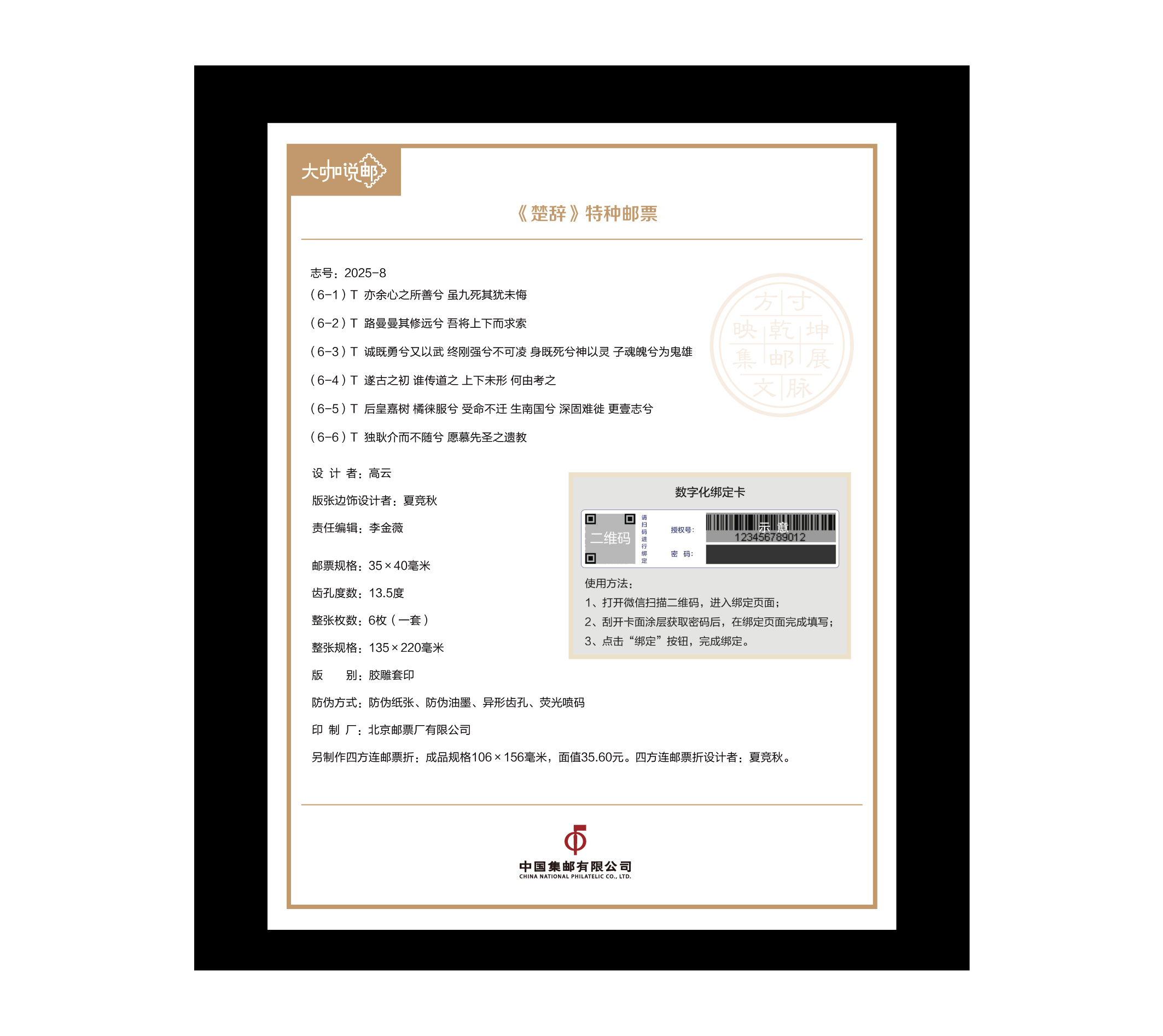 中国集邮有限公司于2025年6月30日发行《楚辞》整版票珍藏(大咖说邮系列)。