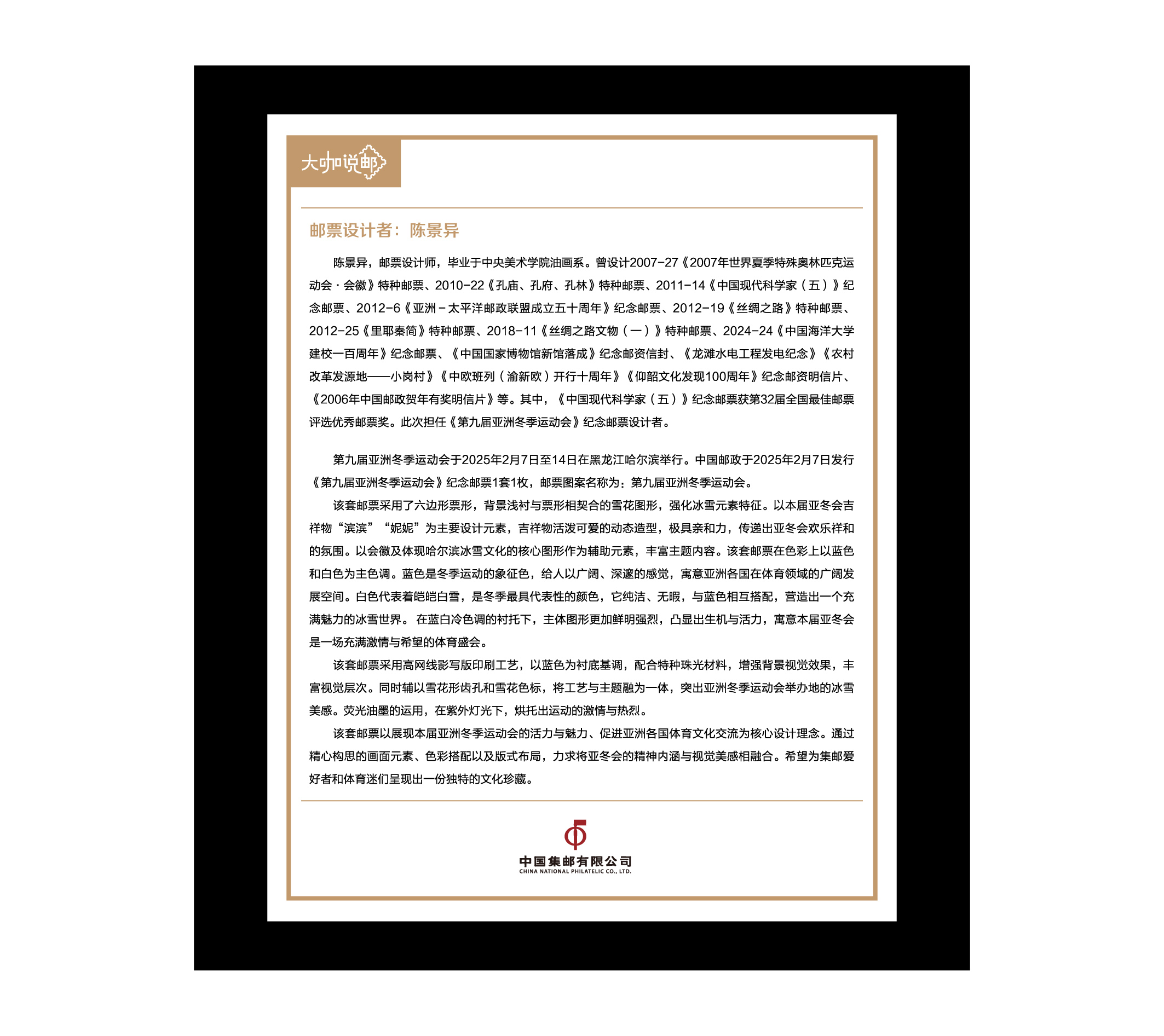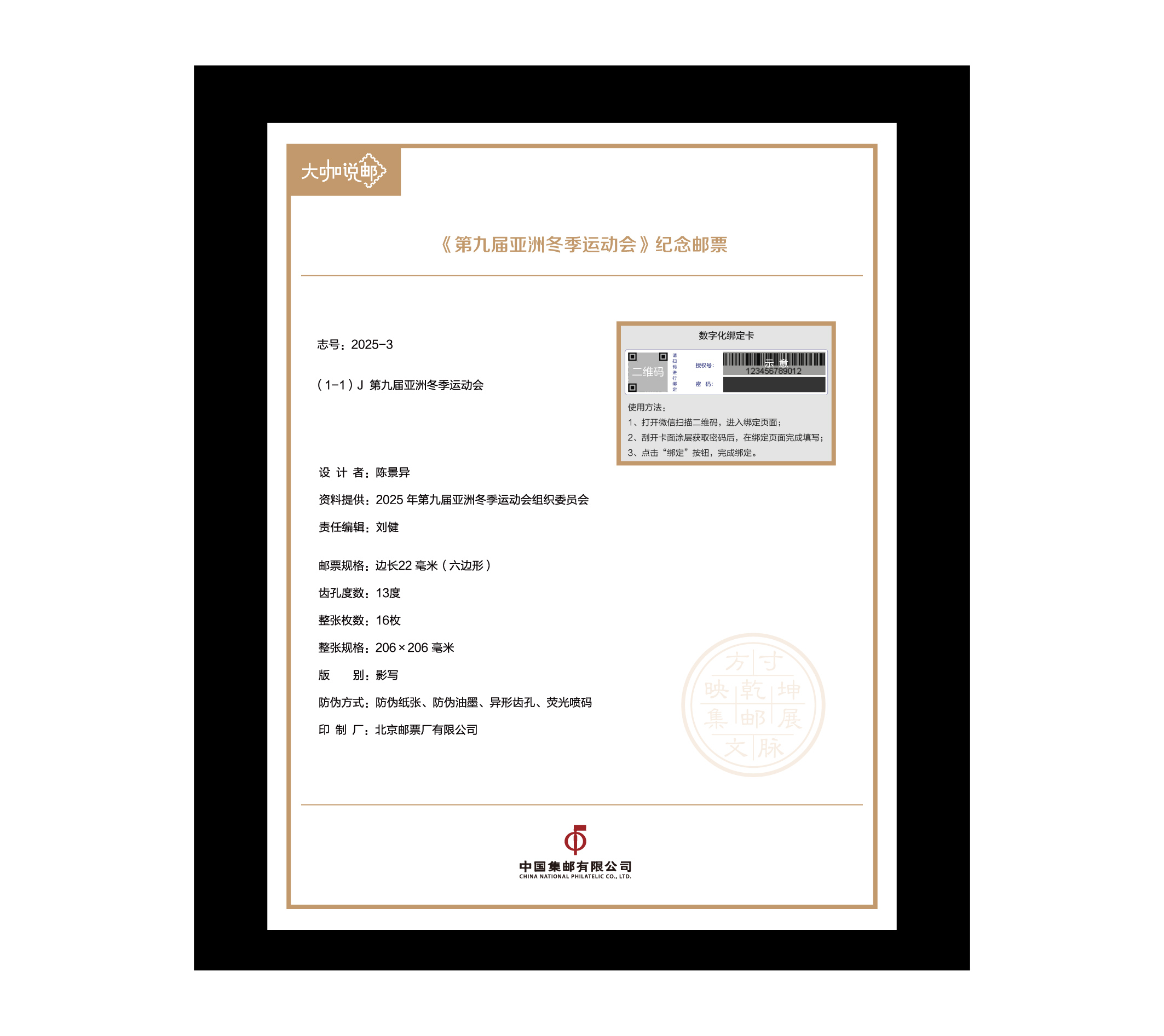 中国集邮有限公司于2025年6月30日发行《第九届亚洲冬季运动会》整版票珍藏(大咖说邮系列)。