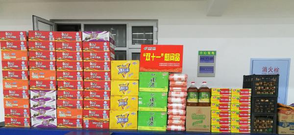 11月20日8时,中国邮政集团公司绥化市邮政工会对转运班、投递班全体职工进行了慰问,为奋战在“双十一”的一线人员送去了豆油、鸡蛋、猪肉、方便面、面包、火腿肠、腐乳等第一批慰问品。