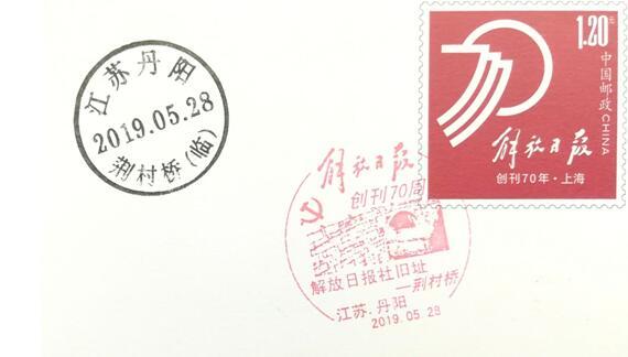 5月28日上午,江苏丹阳邮政在丹阳开发区《解放日报》筹备期间的旧址荆林村村委会举办“《<解放日报>在上海创刊70周年》纪念邮资信封首发活动”。丹阳市邮政部门的工作人员现场为邮迷们加盖专门刻制的纪念邮戳及临时邮戳。首发活动吸引了江苏南京、常州、苏州、南通、上海、浙江等地及丹阳本地的集邮爱好者们参与。
