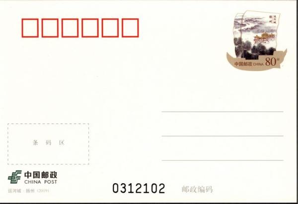 中国邮政定于2019年10月20日发行《运河城·扬州》普通邮资明信片1套1枚。详情如下: