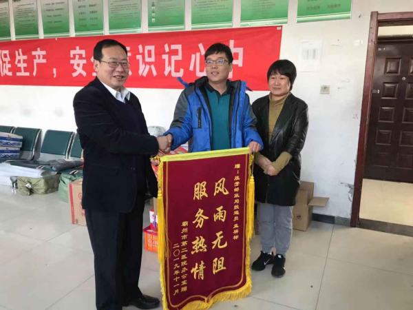 近日,霸州市第二医院办公室薛明丽主任代表全院职工,为廊坊分公司直属胜芳支局投递员孟祥标送来了“风雨无阻 服务热情”锦旗。期间,不断赞扬投递员孟祥标同事的爱岗敬业精神,六年来,无论风霜雨雪每天都热情礼貌地坚持给二院送信送包裹,得到霸州市第二医院全体职工的认可,“平凡的小事每天坚持做下去就是伟大”。