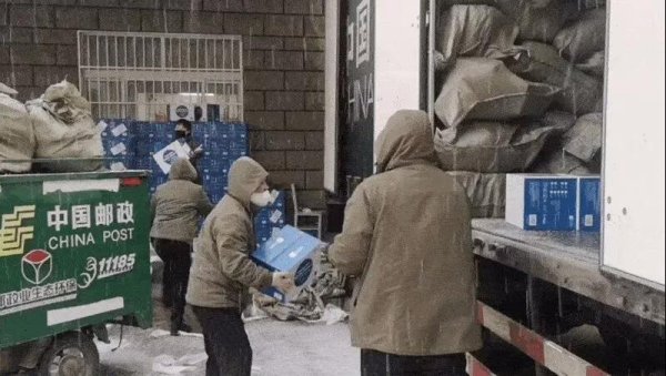 保障防疫物资第一时间运达一线,2月14日,唐山市滦南县分公司邮件处理中心工作人员冒着风雪装运防疫物资3000余件。他们说:“要尽自己的微薄之力做好物资运送的‘第一关’,只有我们快点,防疫物资才能更快抵达目的地。”