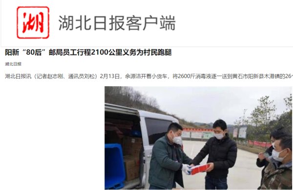 33岁的余源洁是阳新县邮政局木港支局员工。正月初三,他听说因各村设卡封路,有些村到镇里领取防疫物质要经过多道关卡,耽误功夫。“若是镇上统一派送岂不是又省事又省力?”于是,他开着自家面包车,到镇防疫指挥部主动请缨,承担下义务为各村运送防疫物资的任务。