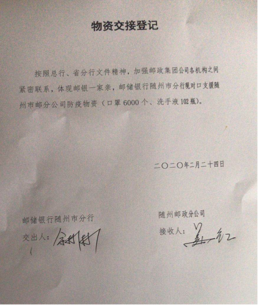 据悉,为体现邮银协同精神,支援邮政公司履行国家队职责,奋战抗疫一线,打赢疫情防控阻击战,按照邮储银行总行相关指示精神和湖北省分行党委统一安排,各市州分行对口支援各市州邮政公司一部分防疫物资,对口支援以领用形式解决,费用纳入各市州分行支出。邮储银行随州市分行接到通知后,分行主要领导高度重视,亲自部署,第一时间将防疫物资转交给市邮政分公司。
