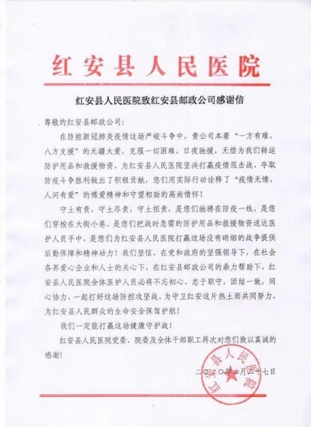 “是您们驰骋在防疫一线、是您们穿梭在大街小巷、是您们把战时急需的防护用品和救援物资送达医护人员手中、是您们为红安县人民医院打赢这场没有硝烟的战争提供坚强的后勤保障和精神动力!”2月27日,红安县人民医院致信红安县邮政分公司,对邮政员工克服困难、日夜驰援,为医护人员及时送达并主动搬运防护用品和救援物资至指定仓库表示感谢,认为 邮政用实际行动诠释了“疫情无情,人间有爱”的博爱精神和守望相助的高尚情怀。