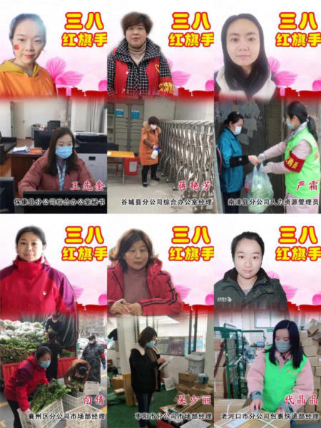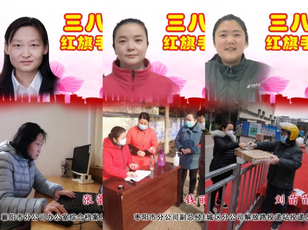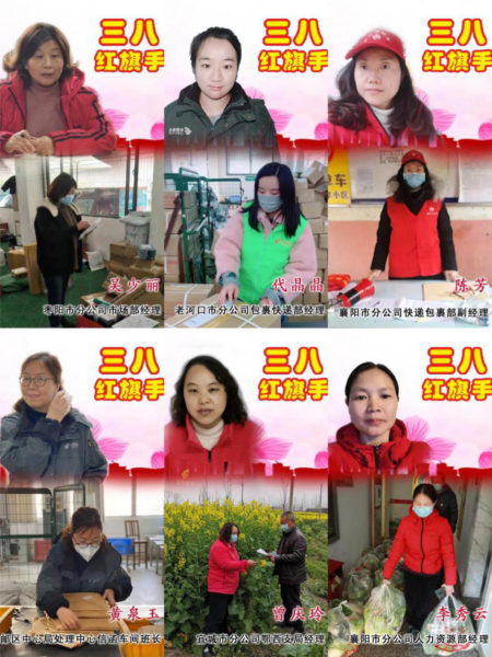 2020年3月8日,第110个“三八”国际劳动妇女节到来之际,襄阳市邮政分公司决定授予宜城分公司鄂西支局经理曾庆玲、老河口分公司包裹快递部经理代晶晶、谷城分公司综合办公室经理 蒋艳芳、保康分公司综合办公室办事员王先奎、枣阳分公司市场部经理吴少丽、枣阳分公司副总经理钱丽、南漳分公司综合办公室办事员严霜、襄州分公司市场部经理向倩、樊城分公司襄城投递站投递员 陈秀琴、樊城分公司解放路投递站投递员刘苗苗、襄城分公司卧龙支局投递员朱玉敏、邮区中心局处理中心信函车间班长黄泉玉、市分公司快递包裹部副经理陈芳、市分公司人教部经理李秀云、市分公司综合办公室秘书张蕾15名同志“三八红旗手”荣誉称号。