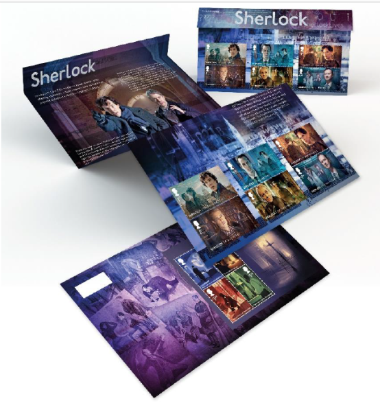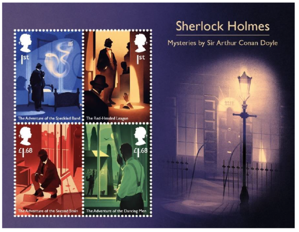 推出剧集套票的同时,英国皇家邮政还选取了原著作者阿瑟·柯南·道尔本人最满意的四个福尔摩斯故事发行小全张一枚,分别是《花斑带之谜》(收录在《冒险史》)、《红发会》、《第二血迹探案》、《小舞人探案》。小全张邮票主图采用著名概念艺术家卡罗利斯·斯特劳特涅卡斯(Karolis Strautniekas)创作的故事插画,边饰为标志性的贝克街221B号(福尔摩斯侦探事务所)门牌图案,构图经典、引人深思。