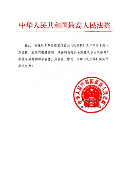 在此,我院对贵单位在宣传普及《民法典》工作中给予的大力支持、发挥的重要作用、取得的良好社会效益表示由衷感谢!期待今后继续加强合作,为宣传、推进、保障《民法典》实施而共同努力!