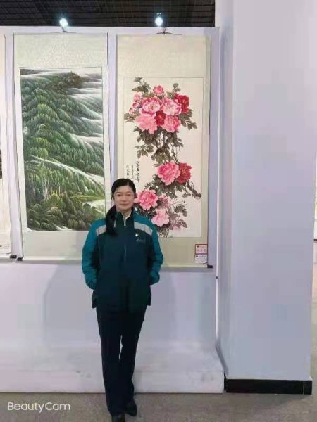 为庆祝中国共产党百年华诞,歌颂党的丰功伟绩,歌颂全市职工群众团结一心、攻坚克难、锐意进取的精神风貌,展现黑河经济社会发展取得的巨大成就,黑河市总工会近日举办了“辉煌一百年 奋斗新时代”黑河市职工书画作品展。黑河邮政选送的作品报刊发行徐丽梅画的国画《富贵牡丹》在展示活动中荣获优秀奖,得到了黑河市总工会的表彰。图为徐丽梅和她的国画在展示中,牡丹花开象征盛世中华,喻意中华民族蒸蒸日上,走向灿烂光辉的明天。